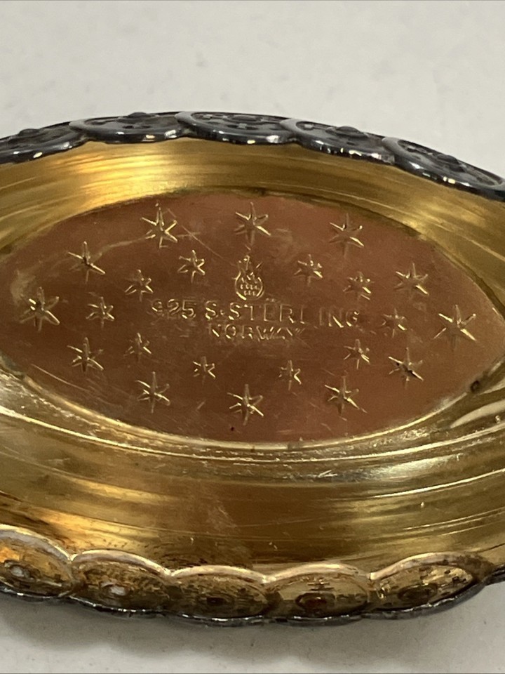 This listing is a 3.5" salt cellar crafted from 925 sterling silver, featuring a Viking ship design. It is made in Norway by Theodor Olsens Eftf. The clear glass insert adds a touch of elegance to this unique and historically-inspired piece. This item weighs 17g and is a charming addition to any collection of antiques or sterling silver items.