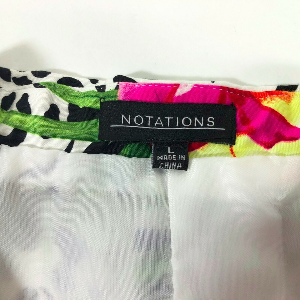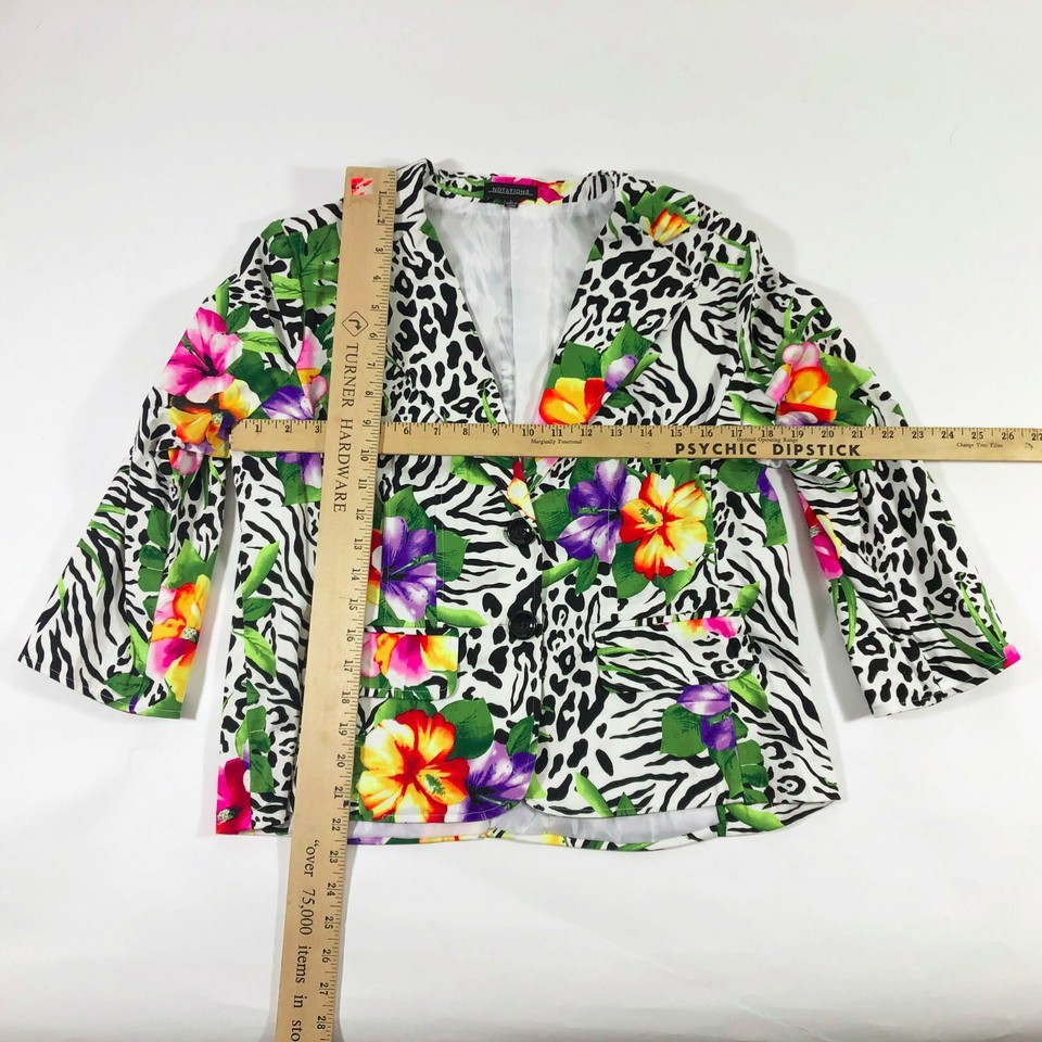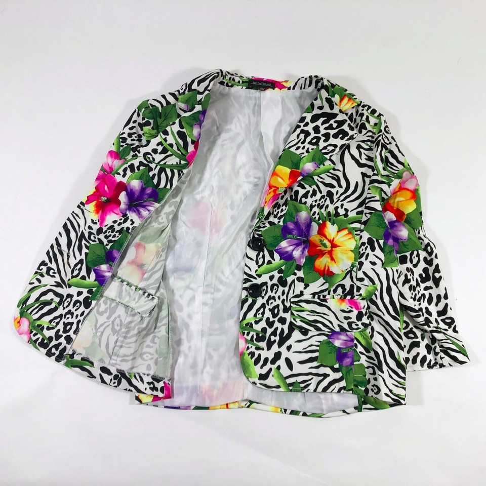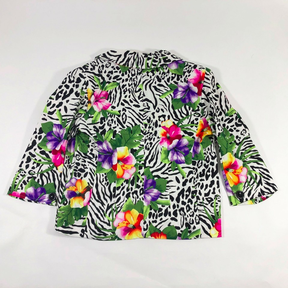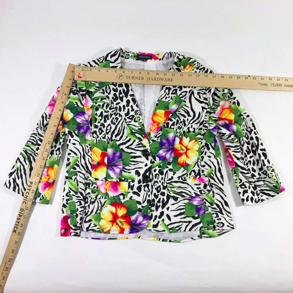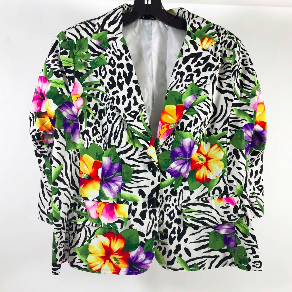 EUC This Notations black white animal print jacket is accented with brightly colored tropical flowers. It's a fun summer jacket to add some pop to your wardrobe. It has 2 black buttons for closure and shoulder pads. 3/4 sleeves and lined in the back. No rips, stains, or tears. Made in China 97% cotton, 3% Spandex Animal and floral print Button closure 3/4 length sleeves US size Large Shoulder pads Arm Pit to Pit 18 inches Sleeve length 17 inches Across the shoulders 17 inches Top of collar to hem 22 inches Hand wash cold line dry SKU R-2-0-0-013