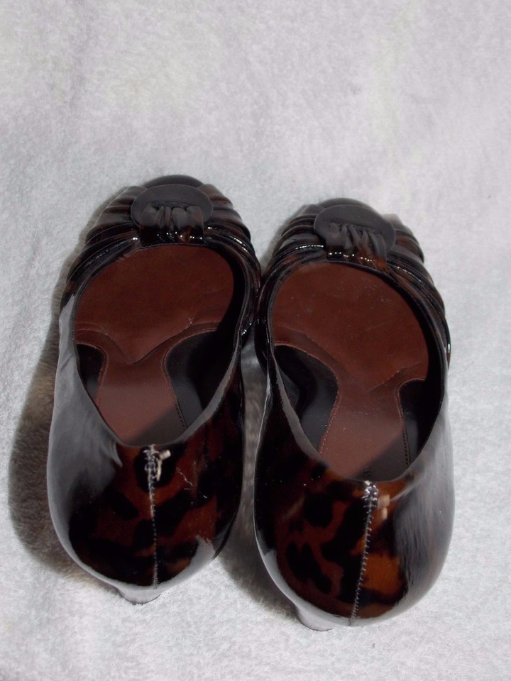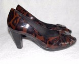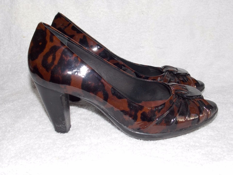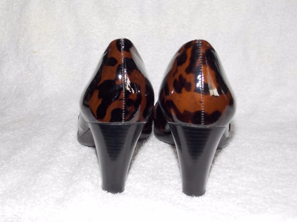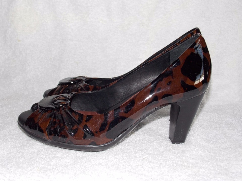 - Nurture Brown/Black CHEETHA Patent Leather Peep Toe Heels 8M Used