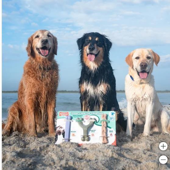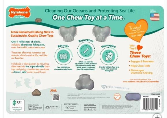 Save our oceans and join Nylabone in helping give countless sea creatures cleaner, safer homes! The Ocean Chew Toy Collection features 3 engaging chew toys made with 30% reclaimed fishing nets. Why fishing nets? Because they contribute to the over 1 million tons of plastic that enter the ocean each year, often trapping numerous sea animals, disturbing marine life, and littering our beaches. Nylabone is taking action by recovering, repurposing, and reimagining these nets into super durable, fun-shaped chew toys furry friends love. Each one features delicious flavor infused throughout, promotes non-destructive chewing habits, and helps clean teeth as dogs chew. Plus, they're free of phthalates and BPA. Let's help clean our oceans and protect sea life...one chew toy at a time!