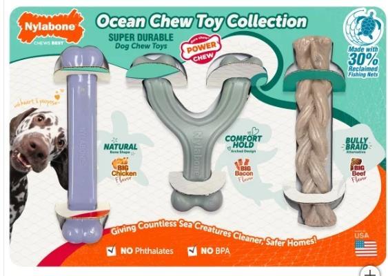 - Nylabone Ocean Chew Dog Toys 3-Count Chicken Bacon Beef Bone Wishbone Braid