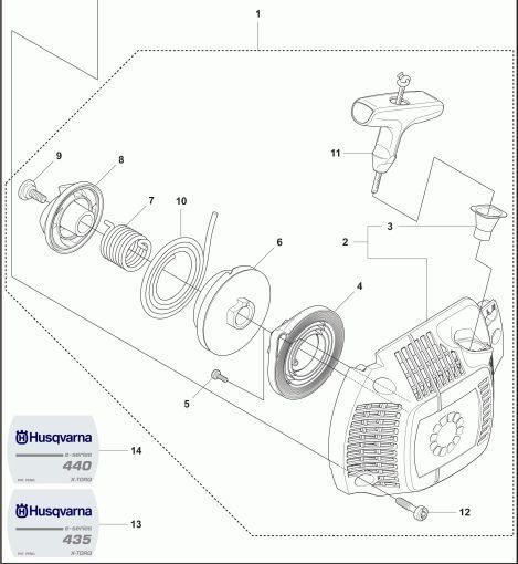 NEW GENUINE OEM Husqvarna Recoil Starter Assembly with model decal, shown as item numbers 1 14 in the schematic.