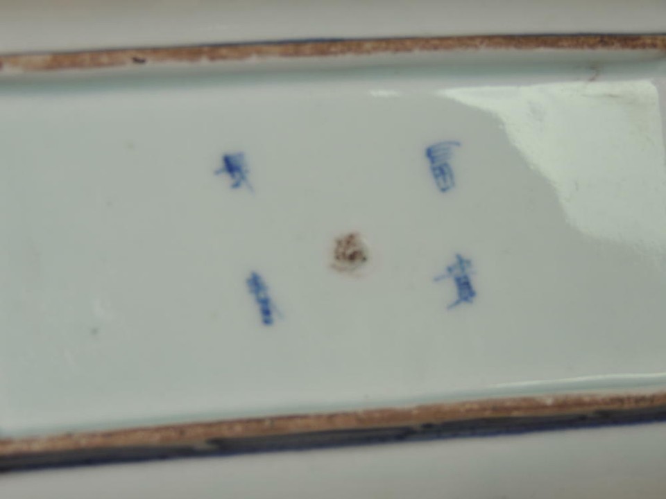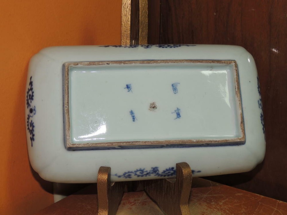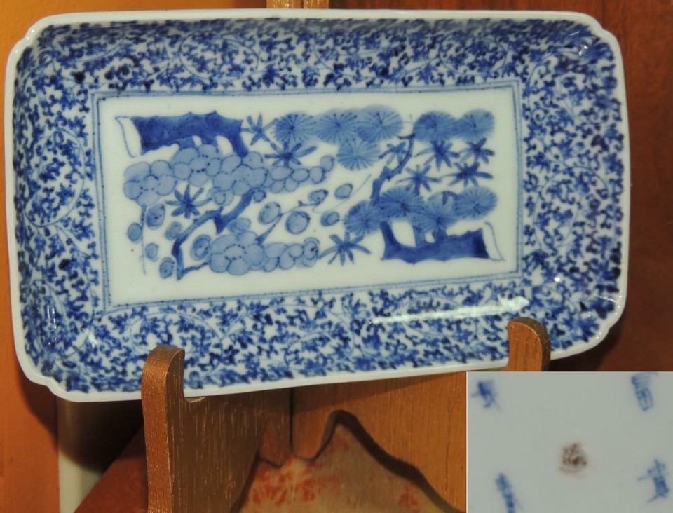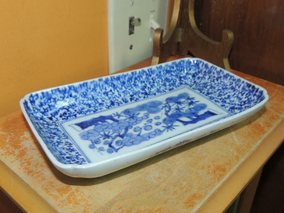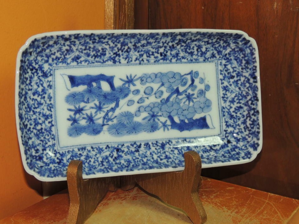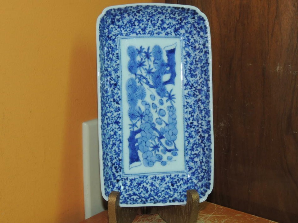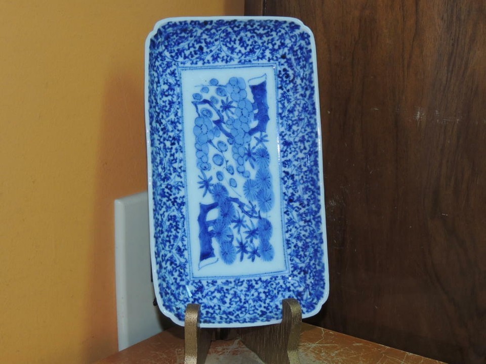 - ONE Japanese Dish/ Tray 8.25"x4.7 Blue White Arita Meiji 19th pos Fuki Choshun 5