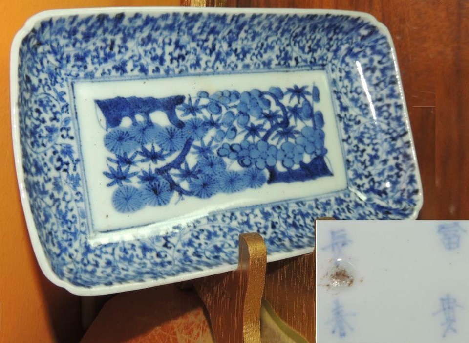 - ONE Japanese Dish/ Tray 8.5"x4.75 Blue White Arita Meiji 19th pos Fuki Choshun 2