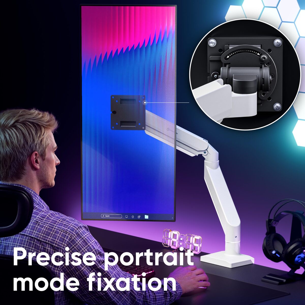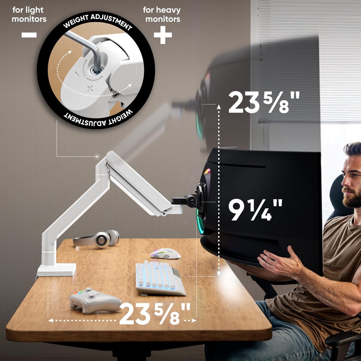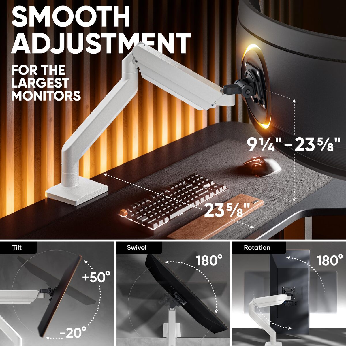 The gas spring system ensures smooth, balanced motion of the 49 inch monitor arm heavy duty, letting you adjust screen height and position with one hand. Crafted from steel, aluminum, and high-quality plastic, the desktop monitor mount combines durability with elegant form. White-and-black finish of this computer monitor arm complements light, modern interiors, while the integrated cable management keeps your workspace clean.