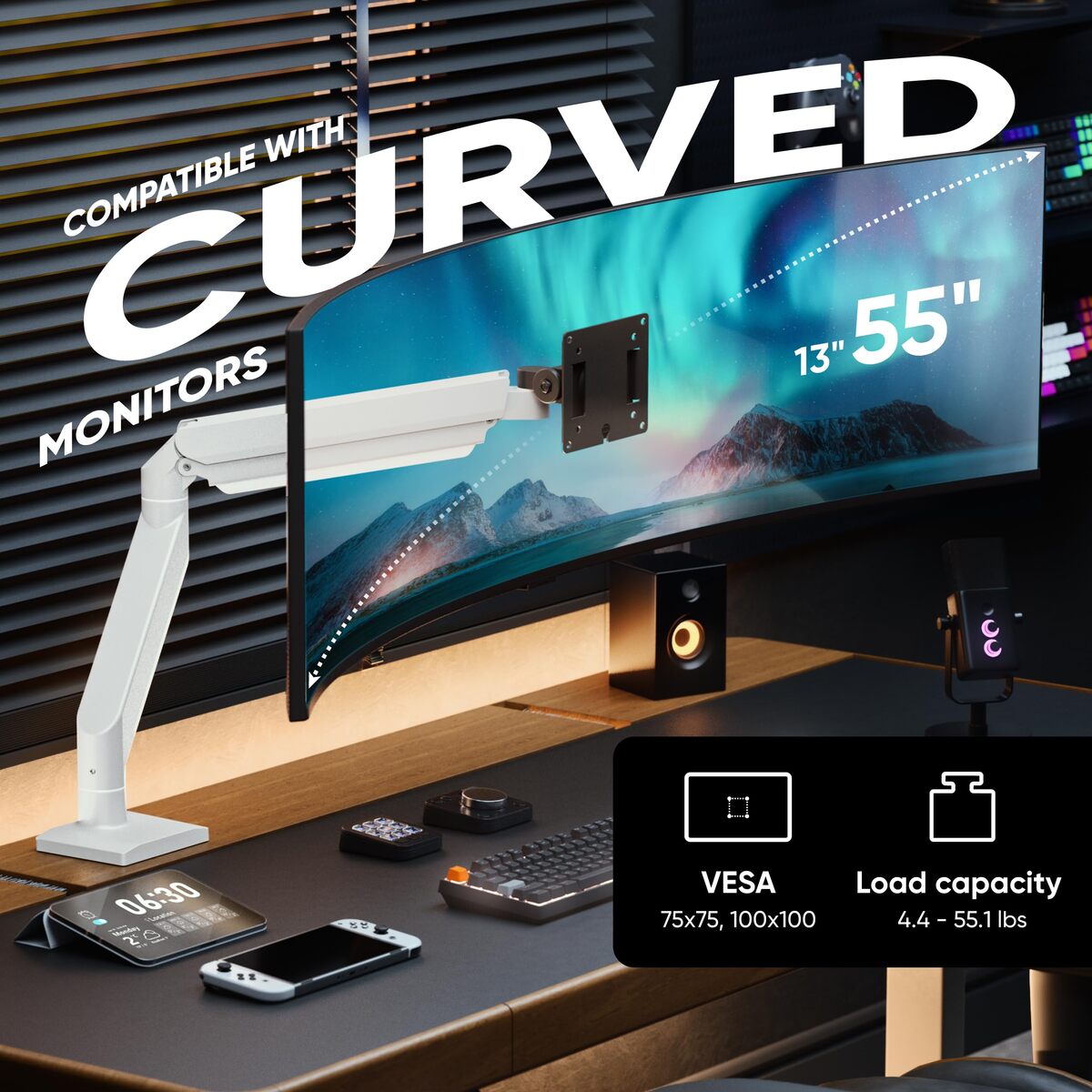 Universal Compatibility – The ONKRON G110-BW single arm monitor mount fits 13 - 55 inch flat, curved, and ultrawide monitors weighing 4.4 - 55.1 lbs. This desk monitor mount supports VESA 75x75 and 100x100 and features a detachable VESA plate for quick and easy installation. A practical and heavy duty monitor stand for office desks, gaming setups, and creative workstations.