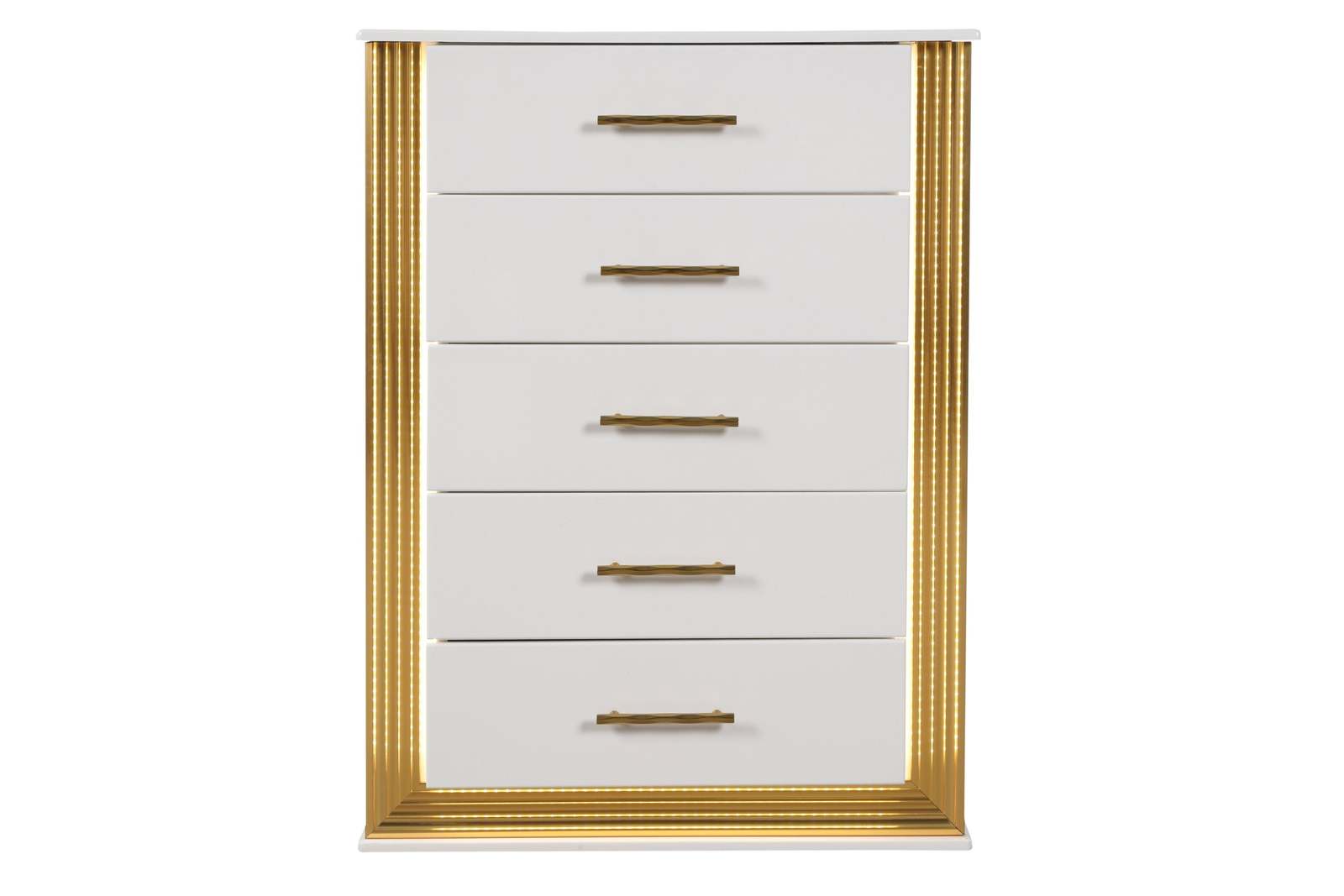 Elevate your bedroom's organization with our contemporary chest, a stylish solution that seamlessly combines functionality and aesthetics. This chest features five spacious drawers, providing ample storage to keep your belongings organized and easily accessible. The addition of LED lights enhances the ambiance, casting a subtle glow that contributes to a sophisticated atmosphere in your contemporary bedroom. Crafted from a combination of solid and manufactured wood, this chest boasts a captivating gold finish, making it a chic and eye-catching addition to your living space. Embrace modern design and chic storage with this contemporary chest that adds both flair and practicality to your bedroom.