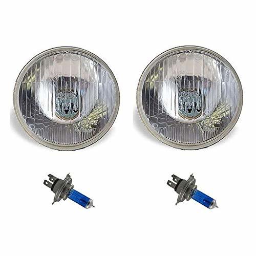 Product description: THESE ARE GLASS FACED HALOGEN SEMI-SEALED BEAM H4 HEADLIGHTS, NOT PLASTIC!! INCLUDES 60/55 WATT H4 SUPER WHITE BULBS THIS LISTING IS FORANEW PAIR (2 bulbs) OF 7" 12 VOLT HIGH/LOW BEAMHALOGEN HEADLIGHTS. THESE ARE SEMI SEALED AND INSIDE BULB CAN BE REPLACED. THESE LIGHT UP 30% BRIGHTER AND LIGHT UP A LITTLEMORE WHITE THEN THE STANDARD STOCK STYLE INCANDESCENT HEADLIGHT BULBS. THESE HAVE THE ORIGINAL 3 PRONG PLUG DESIGN ON THE BACK SO THEY WILL PLUG RIGHT INTO THE ORIGINAL WIRING HARNESS, NO MODIFICATION NEEDED. THESE ARE GLASS ANDWE WILL TAKE EXTRA CARE IN PACKAGING.
