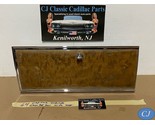 This OEM glove box door is in good condition. Chrome has a nice reflective shine, has some light pitting and average light scratches. Woodgrain is intact, but does have some fading/wear typical for its age. This comes with the lock and key, fully functional to lock and unlock glove box. Hinge operates as it should to open and close glove box door. Please look at all