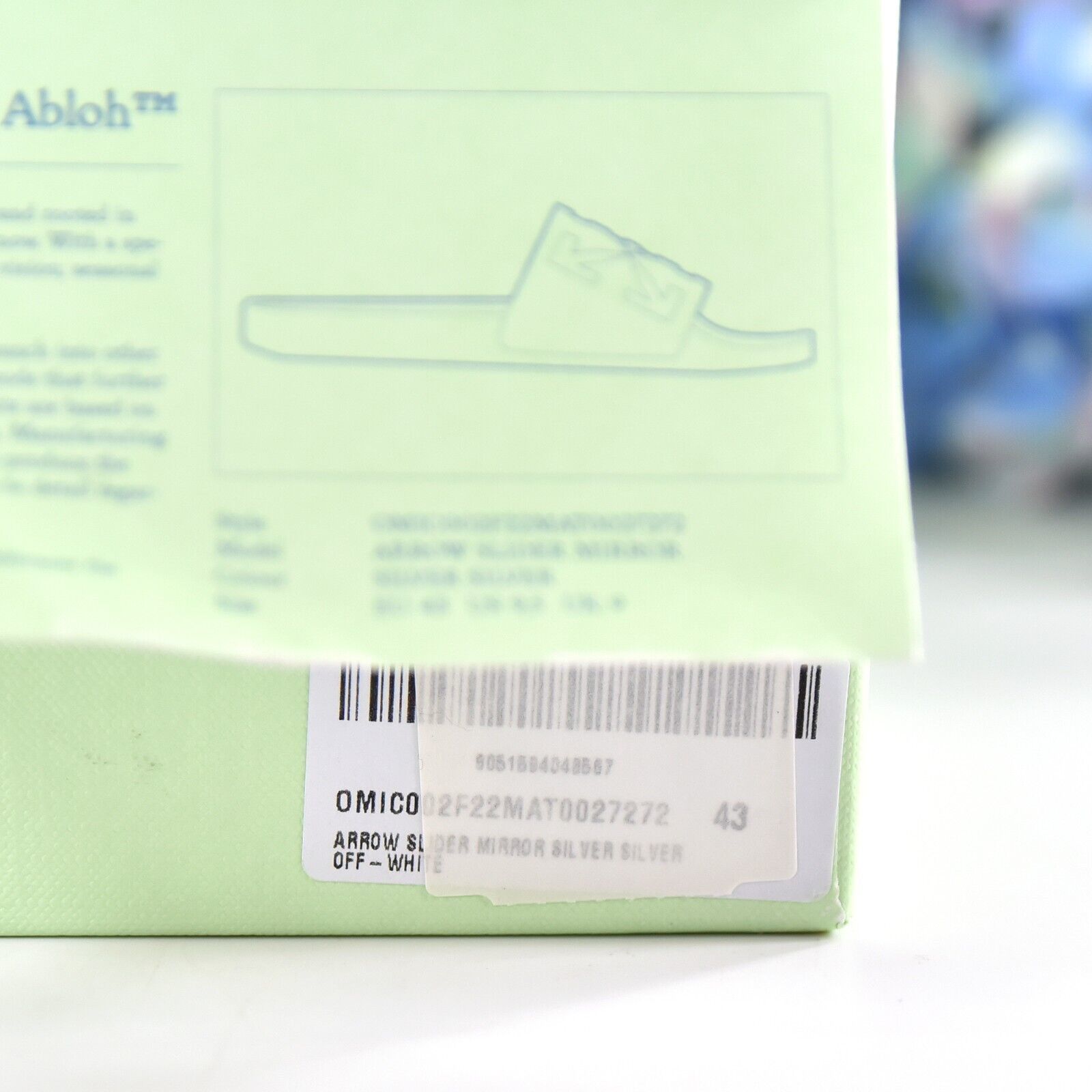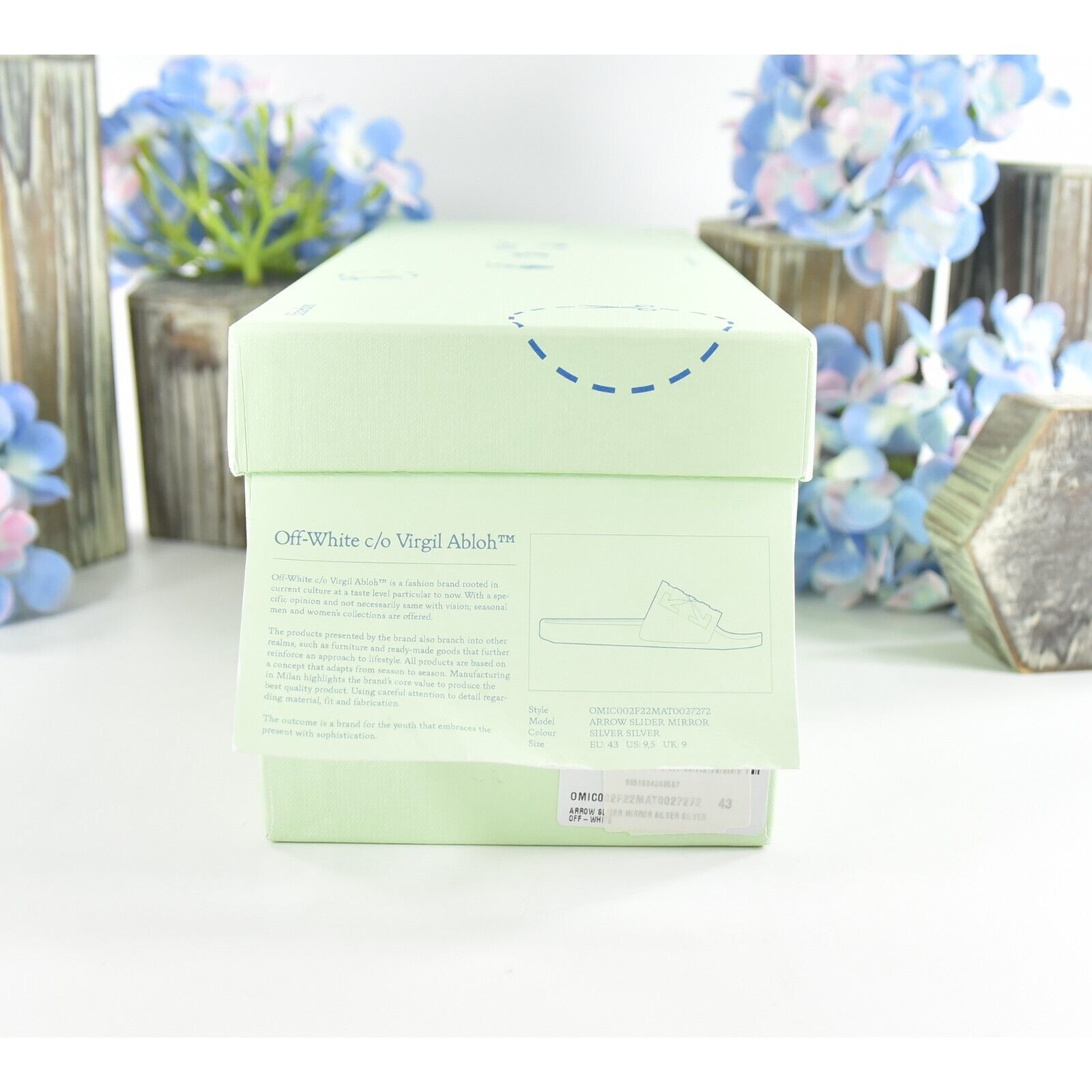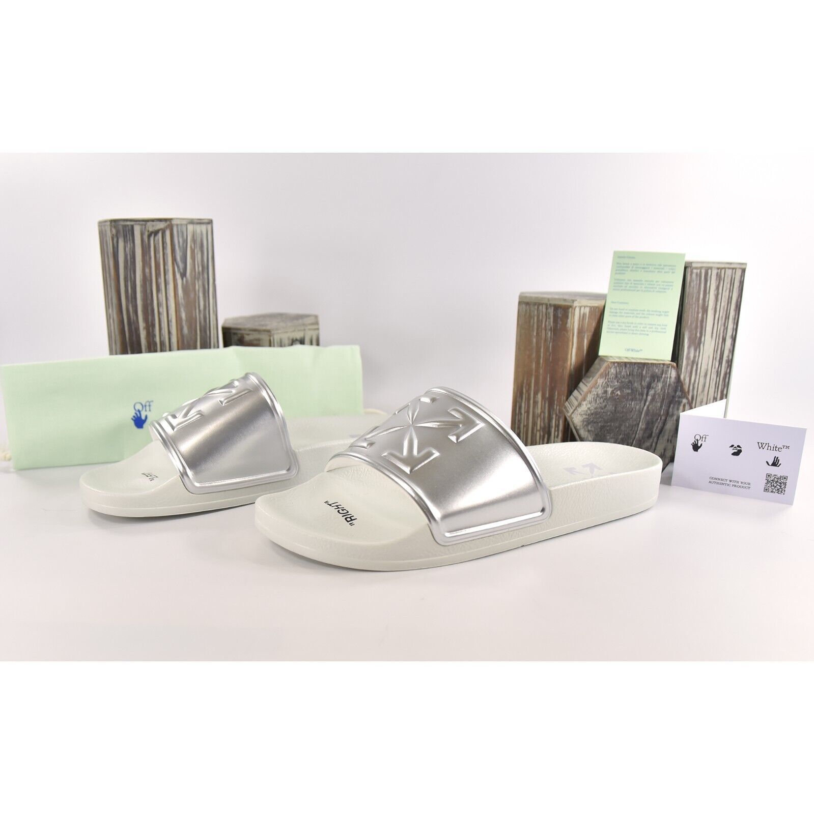 - Off-White HF Mirror Silver Arrow Embossed Logo Rubber Pool Slides 43 NIB