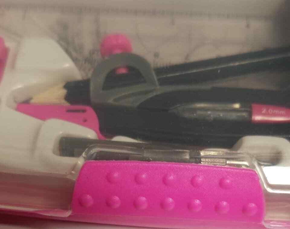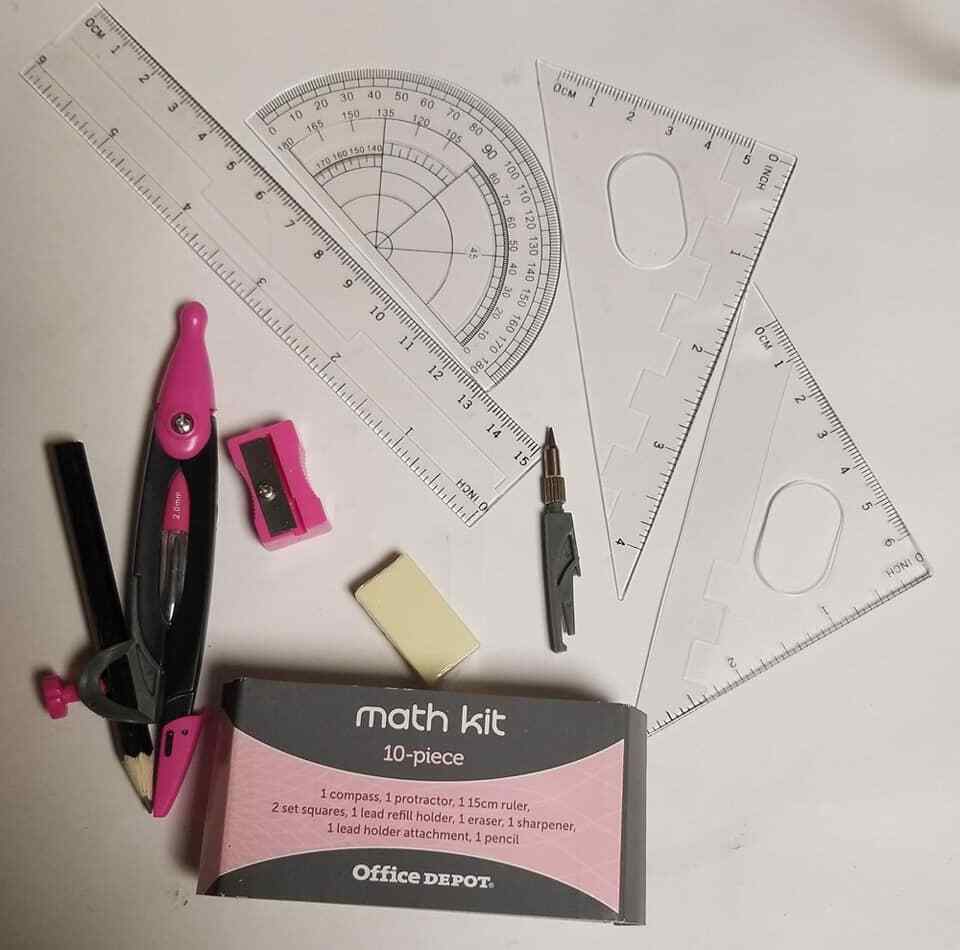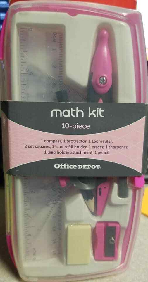 Office Depot Brand 10-Piece Math/Drafting Set Pink Color 1 compass 1 Protractor 1 15cm Ruler 2 Set Squares. 1 lead refill holder 1 eraser 1 sharpener 1 lead holder attachment 1 pencil