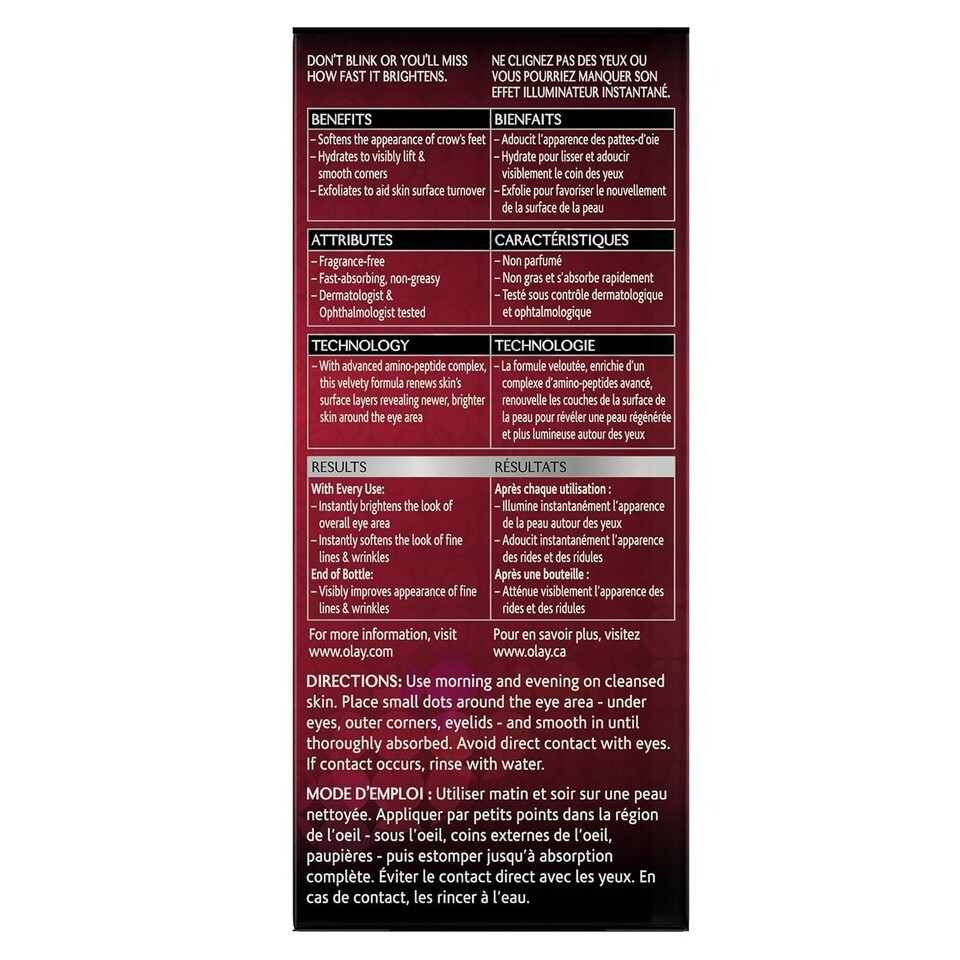 Olay Regenerist Eye Lifting Serum regenerates surface cells for noticeably younger-looking skin with its uniquely formulated advanced Amino-Peptide and vitamin complex. With every use, it instantly brightens the look of the overall eye area and softens the look of fine lines and wrinkles. Its anti-aging formula instantly goes to work at the surface cell level to visibly improve the appearance of fine lines and wrinkles after finishing one bottle.