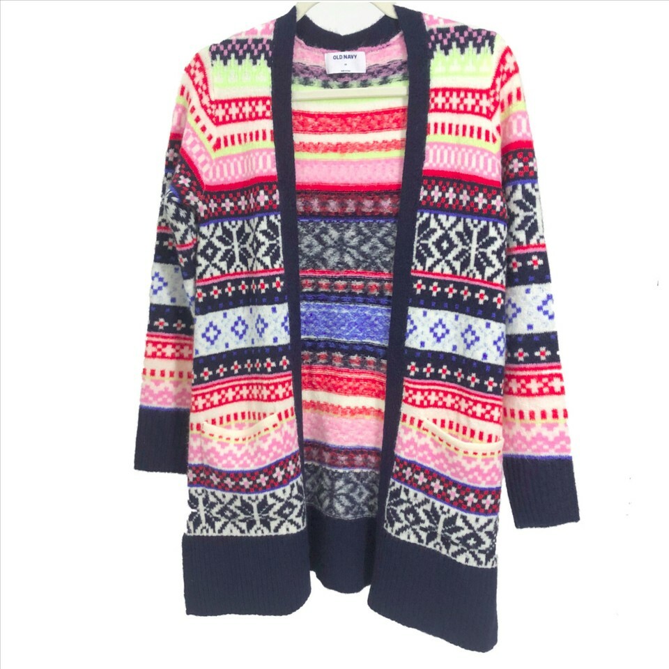 EUC, Very soft multi-color Nordic print open long front cardigan by Old Navy is perfect for layering this fall winter. It has dark navy blue cuffs and trim at the neck down the front. Very minor signs of gentle wear. No rips, stains or tears. Brand: Old Navy Made in China US size Women's XS 70% Acrylic 21% Nylon 3% Spandex/Elastane Long sleeves 22.5 inches Across the shoulders 16 inches Arm pit to arm pit 16.5 inches Shoulder to hem 30 inches Machine wash cold gentle cycle reshape dry flat SKU X-3-11-011