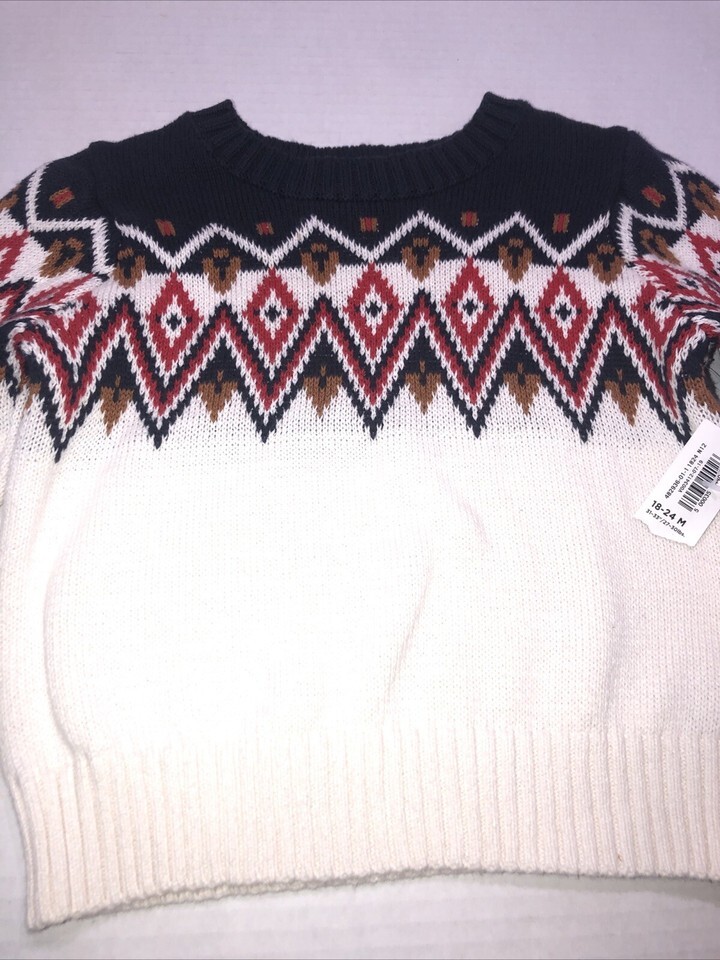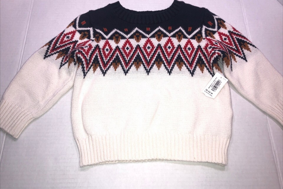 This is an Old Navy toddler boy pullover sweater in size 18-24 months, brand new with tags. The sweater features a multicolor design, making it a stylish and playful addition to a little boy's wardrobe. With its pullover style, it is convenient and easy for parents to dress their child in. Perfect for keeping your little one cozy and comfortable during the cooler months, this sweater is a versatile piece that can be easily paired with different bottoms for various casual or dressy looks.