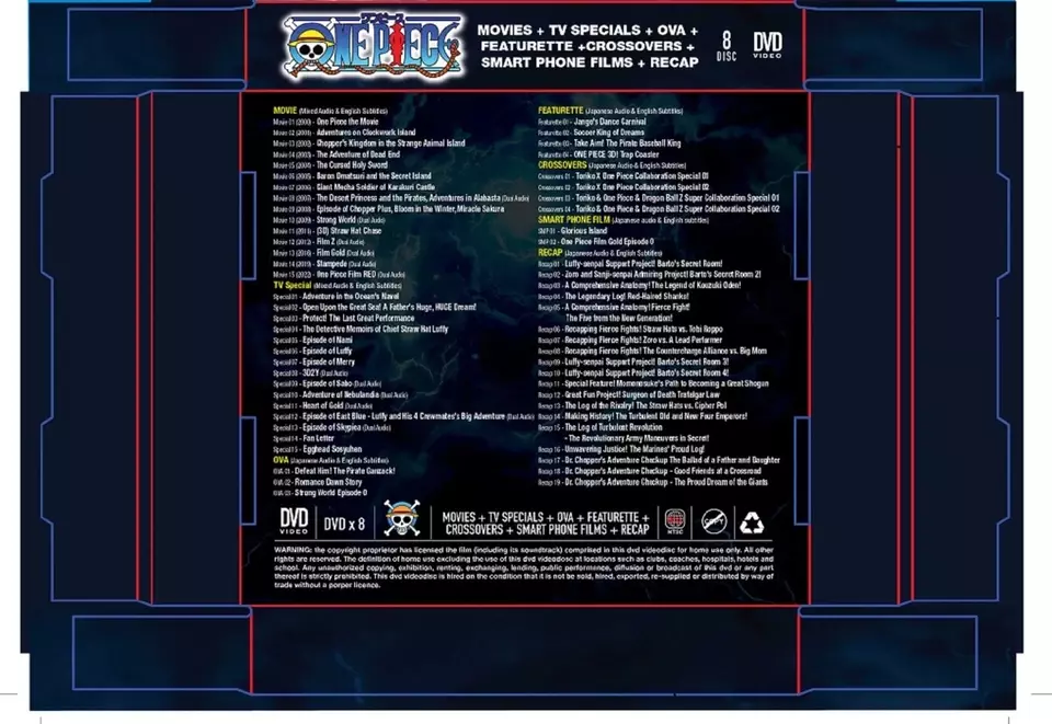 Title Name : One Piece Movie Collection Part 1-15+15Specials+3OVAS+Featurette MOVIE 1 One Piece (JAP/VERSION) 2 Clockwork Island Adventure (JAP/VERSION) 3 Chopper's Kingdom on the Island of Strange Animals (JAP/VERSION) 4 Dead End Adventure (JAP/VERSION) 5 The Cursed Holy Sword (JAP/VERSION) 6 Baron Omatsuri and the Secret Island (JAP/VERSION) 7 Giant Mecha Soldier of Karakuri Castle (JAP/VERSION) 8 The Desert Princess and the Pirates: Adventures in Alabasta (JAP/VERSION) 9 Episode of Chopper Plus: Bloom in the Winter, Miracle Sakura (JAP/VERSION) 10 One Piece Film: Strong World (JAP/VERSION) 11 Straw Hat Chase 3D (JAP/VERSION) 12 One Piece Film: Z (JAP/ENG/VERSION) 13 One Piece Film: Gold (JAP/CAN/ENG/VERSION) 14 One Piece: Stampede (JAP/CAN/ENG/VERSION) 15 One Piece Film: Red (JAP/VERSION) OVA 1 One Piece: Romance Dawn Story (2008) (JAP/VERSION) 2 The Strongest Tag-Team! Luffy And Toriko's Hard Struggle! (JAP/VERSION) 3 Toriko X One Piece X Dragon Ball Z (JAP/VERSION) SPECIAL 1 One Piece TV Special: Adventure in the Ocean's Navel (JAP/VERSION) 2 One Piece: Open Upon the Great Sea! A Father's Huge, HUGE Dream (JAP/VERSION) 3.One Piece: Protect! The Last Great Stage (JAP/VERSION) 4 One Piece: The Detective Memoirs of Chief Straw Hat Luffy (JAP/VERSION) 5 Episode of Nami: Tears of a Navigator and the Bonds of Friends (JAP/VERSION) 6 Episode of Luffy: Adventure on Hand Island ode of Merry: The Tale of One More Friend (JAP/VERSION) 8 3D2Y (JAP/ENG/VERSION) 9 Episode of Sabo: The Three Brothers' Bond โ€“ The Miraculous Reunion and the Inherited Will (JAP/VERSION) 10 One Piece: Adventure of Nebulandia (JAP/VERSION) 11 One Piece: Heart of Gold (JAP/VERSION) 12 One Piece: Episode of East Blue: Luffy and His 4 Crewmates' Big Adventure (JAP/ENG/VERSION) 13 One Piece: Episode of Sky Island (JAP/VERSION) 14 Fan letter 15 Egghead Sosyuhen No Of Disc : 8 Disc Version : Japanese Subtitle : English Format : DVD / ALL Region Get a FREE GIFT with every purchase Shipping and Packaging: Thank you for your interest in our product! We are pleased to offer free international shipping for this item. Please note that international delivery typically takes 2-3 weeks. At The Anime Zone, we prioritize the safe delivery of your orders. Our bubble wrapped packages provide excellent protection for fragile items. Each item is meticulously wrapped in multiple layers of high-quality bubble wrap to absorb shocks during shipping. The package is then placed in a sturdy shipping box for added reinforcement. We work with trusted shipping partners experienced in handling delicate packages. You can track your shipment using the provided tracking number. If you encounter any issues, our dedicated customer support team is here to assist you. Trust The Anime Zone for secure and worry-free shipping.