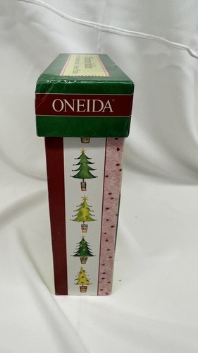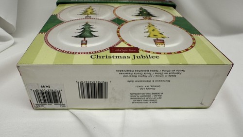 Add some festive flair to your dinner table with this set of four Oneida Christmas Jubilee Stoneware Salad/Dessert Plates. Each plate has a diameter of 8 inches and features a charming Christmas tree pattern in vibrant multicolor. Perfect for your holiday celebration, these plates are made of durable stoneware and can withstand daily use.