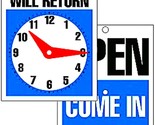 - OPEN COME IN & CLOSED WILL RETURN plastic Sign w Hours CLOCK Hang in Door Window