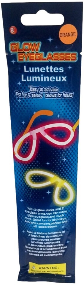 Orange Glow Stick Eye Glasses. Easy to activate. For fun and safety. Glows for hours. With 2 glow sticks and 2 eyeglass arms, you can make flow eyeglasses and much more. Great fun for birthdays, concerts, camping, parties and all celebrations. Contents: 2 Glow sticks. 1 Eyeglass Bridge. 2 Eyeglass arms. Recommended ages 3+. DDD-79328-GLASSESORANGE
