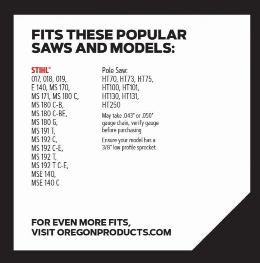 Designed for homeowners and landscapers, the low-vibration, low-kickback Chamfer Chisel cutters offer outstanding performance. for chainsaw models that run 3/8 Inch low-profile pitch, .043 Inch (1.1 mm) gauge, 55 drive links Fits these chainsaw models: Stihl - 017, 018, 019, E 140, MS 170, MS 171, MS 180 C, MS 180 C-B, MS 180 C-BE, MS 180 G, MS 191 T, MS 192 C, MS 192 C-E, MS 192 T, MS 192 T C-E, MSE 140, MSE 140 C and more Precision, heat-treated semi-chisel chain cuts smoothly with a higher tolerance for debris. Tough, long-lasting chrome outer layer and hardened rivets help reduce wear and chain adjustments Built-in Lubri-Tec automatic oiling system extends the life of your chain by delivering oil to key parts of the chain so you can work smarter with less downtime and maintenance Tough, long-lasting chrome outer layer and hardened rivets help reduce wear and allow for fewer chain adjustments For saw sizes up to 42 cc
