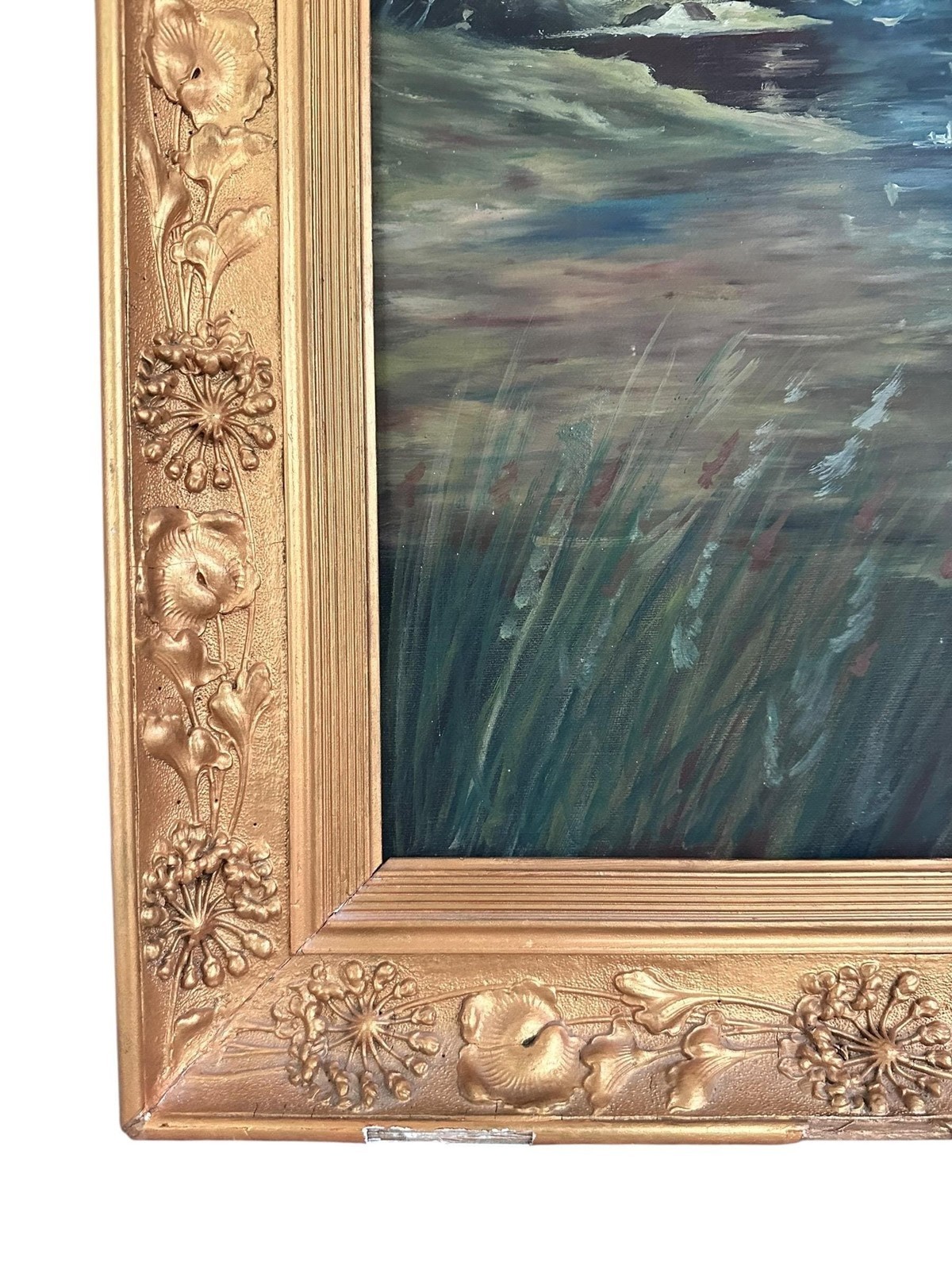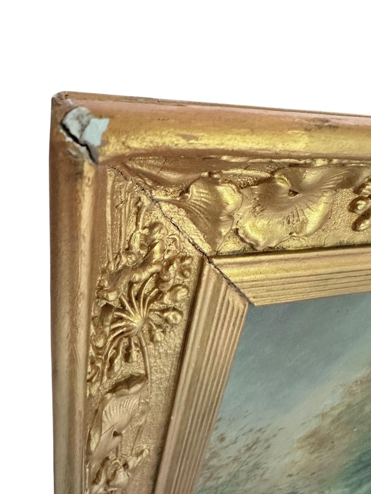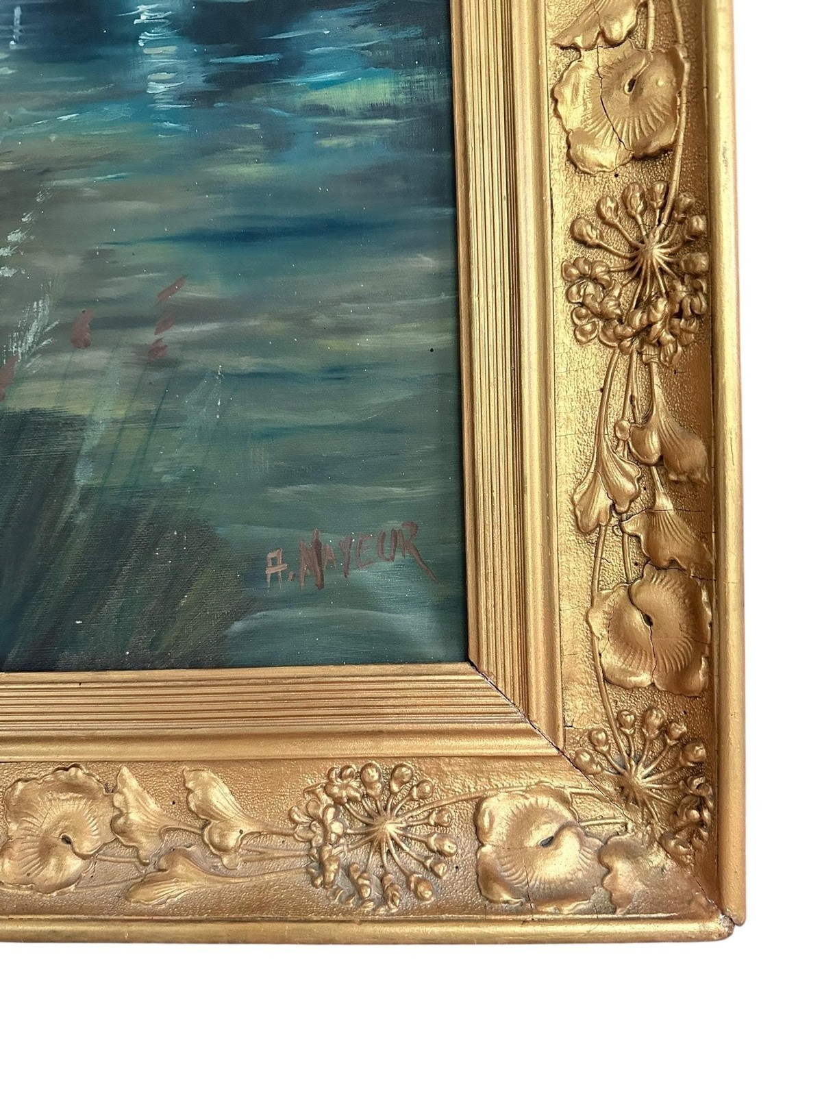 Bring a touch of authentic French charm to your home with this original oil painting by E. Mayeur, acquired from a historic chateau in the Loire Valley, France, in 2025. The artwork beautifully captures a serene forest scene with a reflective stream, showcasing the artist?s skill in light and texture typical of classic French landscape painting. The painting is housed in an ornate gilded wooden frame?likely a combination of wood and decorative plaster?featuring intricate floral motifs that enhance its timeless appeal. Condition: ? Structurally sound overall ? Two small punctures in the canvas, visible mainly from the reverse side ? Some surface dust and light wear consistent with age ? A few chips/cracks to the frame?s plaster ornamentation Frame is dusty. Please take a look at photos/video. They are part of condition description. Despite these age-related imperfections, the piece displays beautifully and exudes the elegance and authenticity of French chateau art. Any shipping overages will be returned (exact weight and measurements will be calculated after packing)