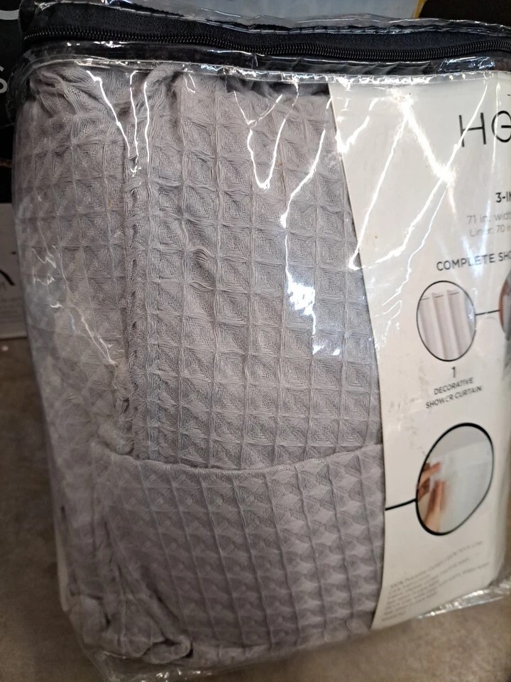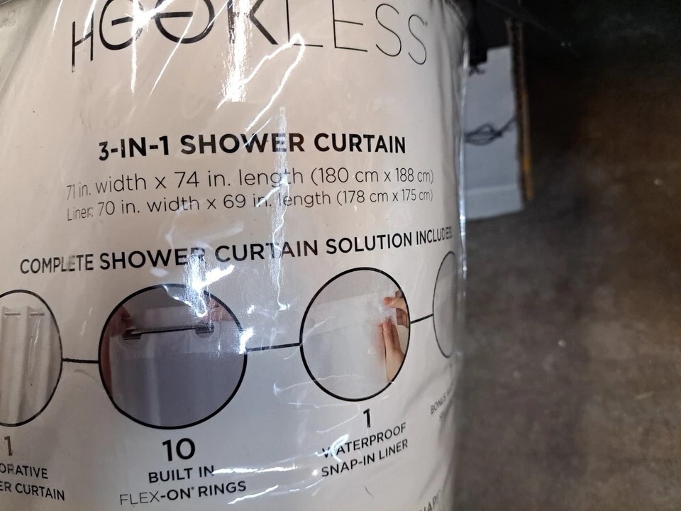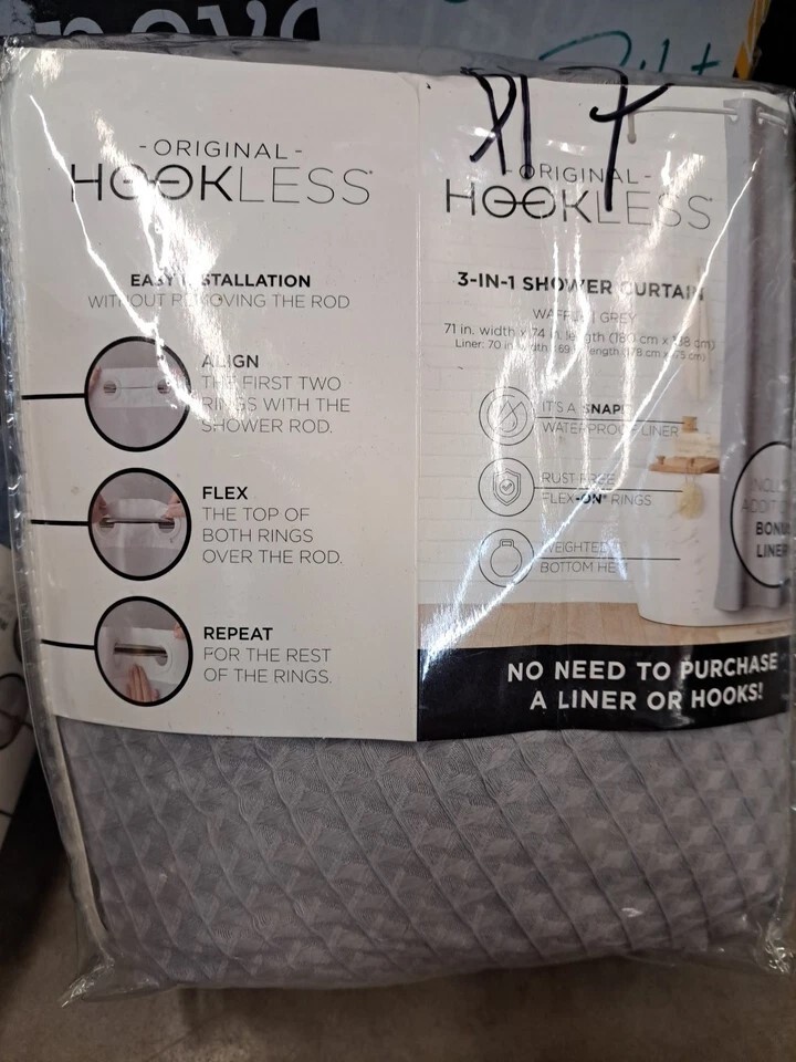 Original Hookless 3-in-1 Shower Curtain complete solution includes WAFFLEGREY The Original Hookless 3-in-1 Shower Curtain set offers a complete bathroom solution in Waffle Grey, featuring a built-in Flex-On ring design, a snap-in fabric liner, and a sheer top window for added light. This all-in-one, hotel-quality curtain ships neatly packaged and ready for quick installation with no hooks required.