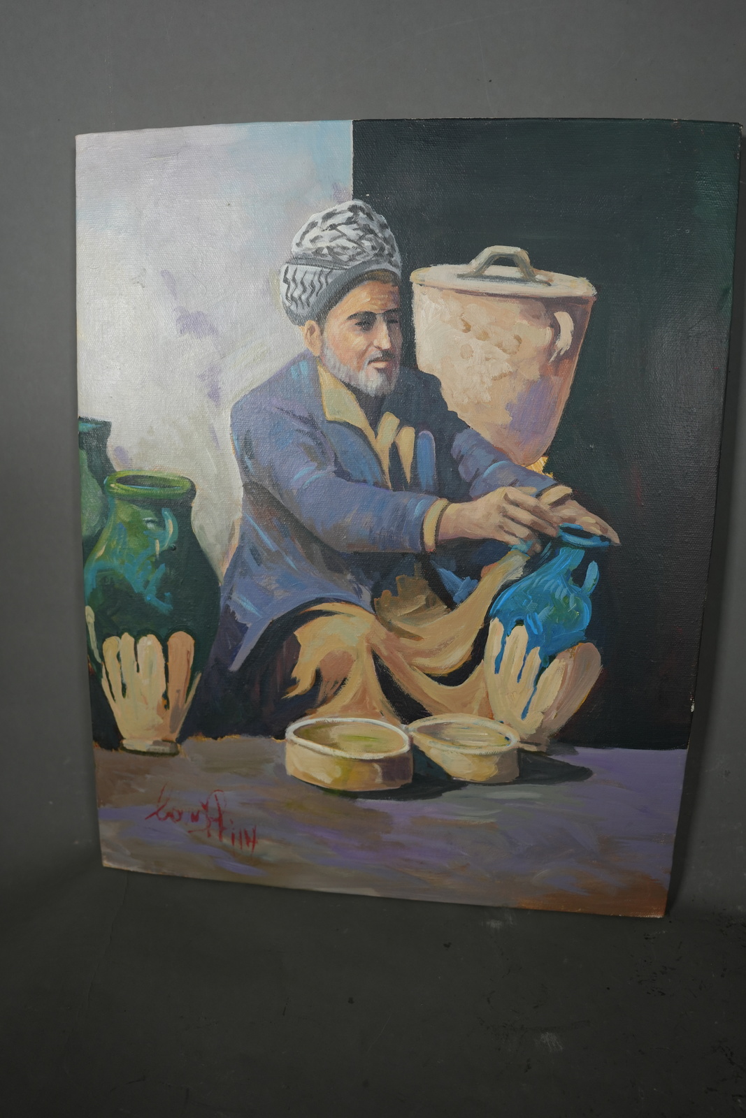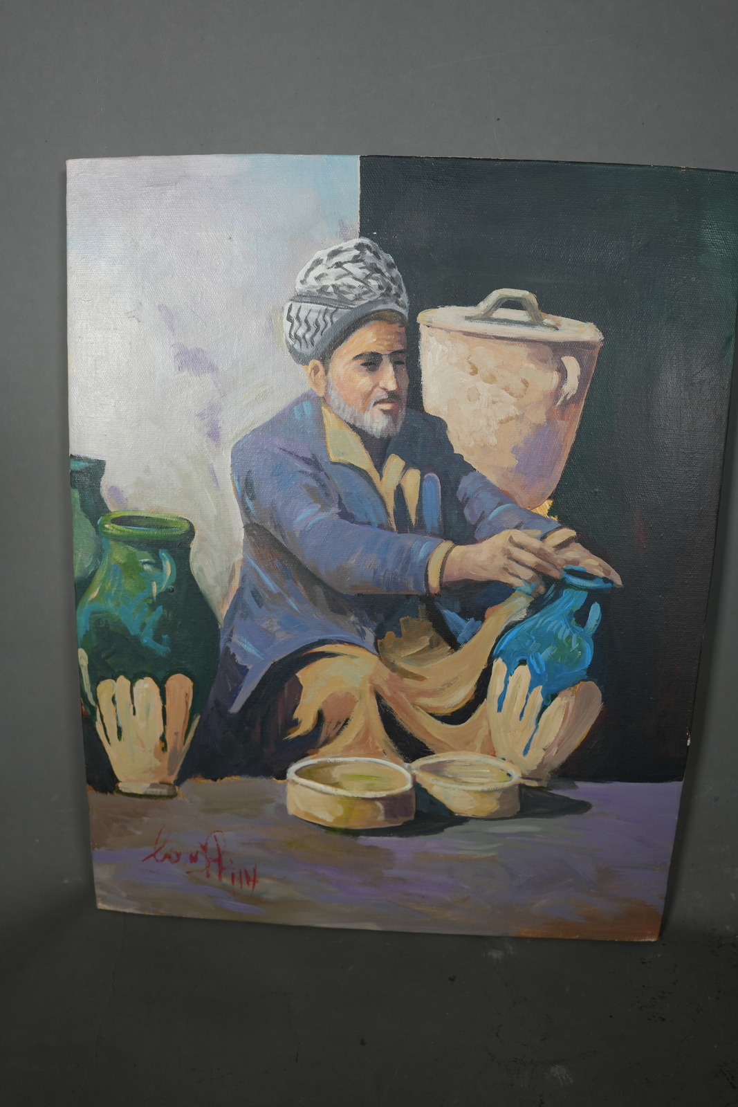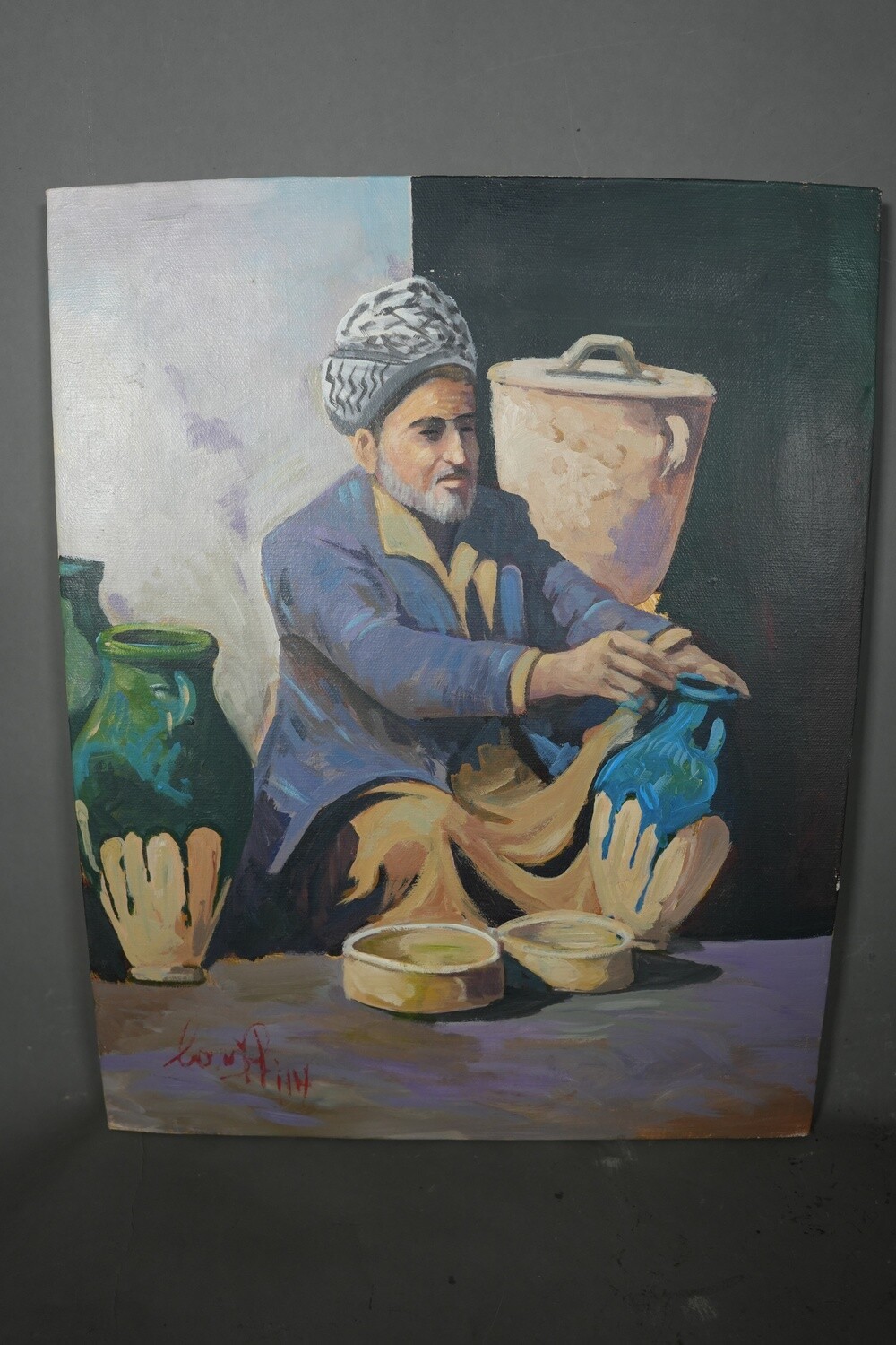 - Original Oil on Canvas Folkloric Iraqi Pottery Man Orientalist Painting 1980s