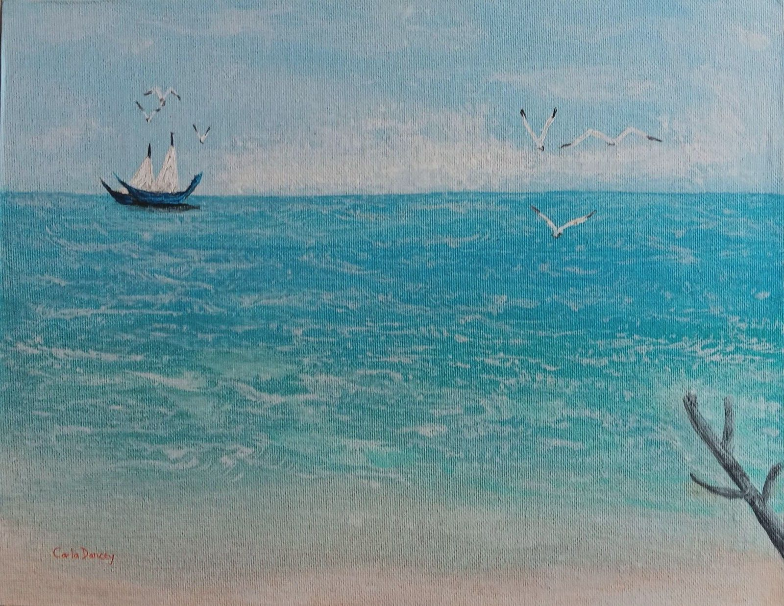 Experience the serene beauty of the ocean with this original painting titled "Serenity" by artist Carla Dancey. The medium-sized (14x11 inches) canvas board painting features a seaside scene with rolling waves, sand beach, seagulls, and sailboats in an impressionist style. The acrylic painting is signed by the artist and comes with a Certificate of Authenticity.