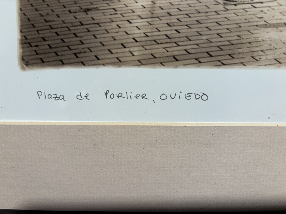 This is an original signed photograph by artist Alan Blaustein titled "Amanti Art Plaza De Porlier." The medium-sized print is matted and framed, showcasing a landscape image in a realistic style. Handmade in Spain, this artwork features ink on paper and is signed by the artist. The subject of the photograph appears to focus on agriculture and Paris, with a European cultural influence. This first edition piece from the Ultra Contemporary period is a unique addition to any art collection.