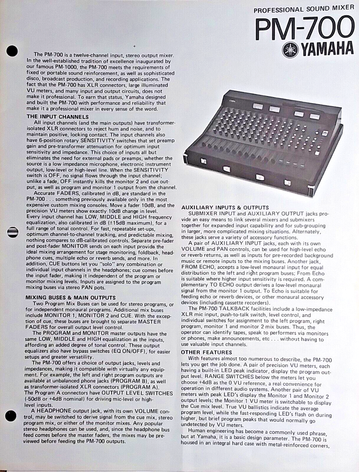 - Original Vintage Owner's Manual Booklet for the YAMAHA PM-700 Pro Sound Mixer.