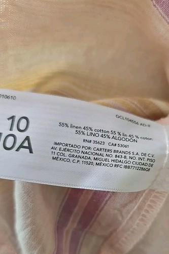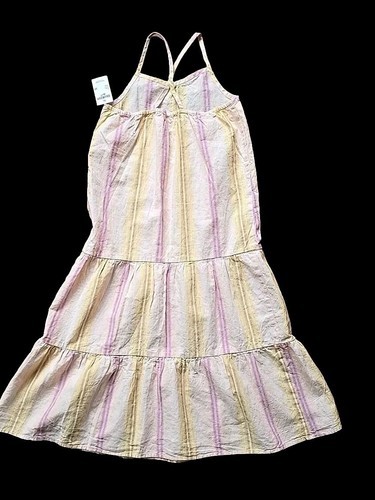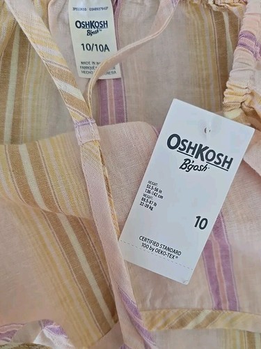 This Sale is for One (1) Osh Kosh B'Gosh Dress Girls' Size 10 Measures approximately 39" from top of shoulder strap to hemline Measures approximately 13.5" ~ while laying flat ~ across the armpit area (has an elastic band on the backside at this area) Multicolored ~ Striped Pattern Pull-Over Tiered Midi Length Natural waistline Thin straps 55% Linen ~ 45% Cotton Machine wash ~ Tumble dry Dress is new with tags Please view photos for a good description of this item Thank you!