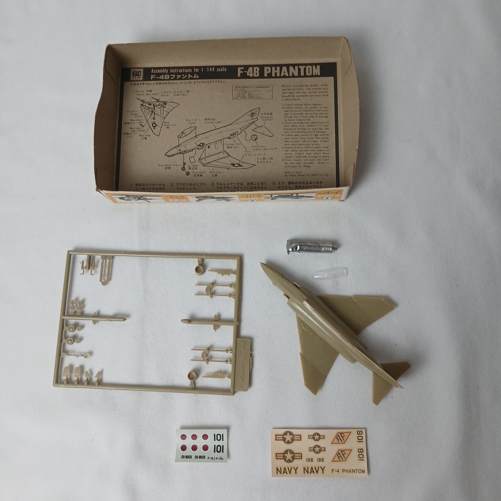 F-4B Phantom This listing is for an original Otaki model kit featuring the F-4B Phantom Fighter plane. This item is in the original open box. The model kit is partly assembled with instructions. Some pieces may be missing. The model is 1:144 scale. Glue and paint are not included. Use for parts or kitbash. This item ships USPS Ground Advantage. International buyers use international shipping program.