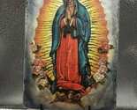 You are purchasing a beautiful arched title with an image of Our Lady of Guadalupe. Comes with scrolled metal stand and also the title has a keyhole hanger for the wall. It measures approximately 8 1/2" X 5 1/2". Bring this beautiful Blessed Mother to your home as one of the marian apparitions. She has been attributed to many miracles.
