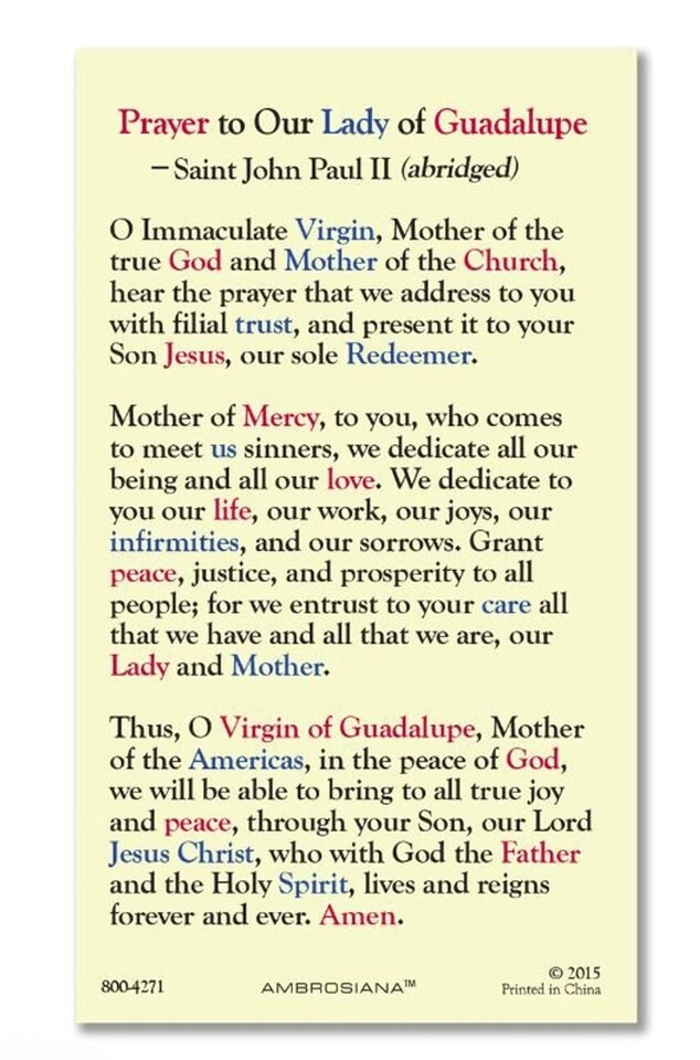 Carry this prayer card with you and pray and have devotion to her as many do after her apparitions in 1531 in Tepeyac hill in Mexico along with Pope John Paul II and the love he had for Our Blessed Mother.