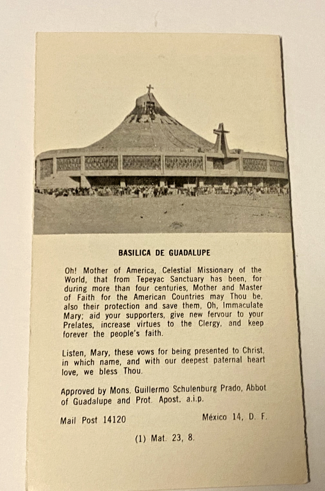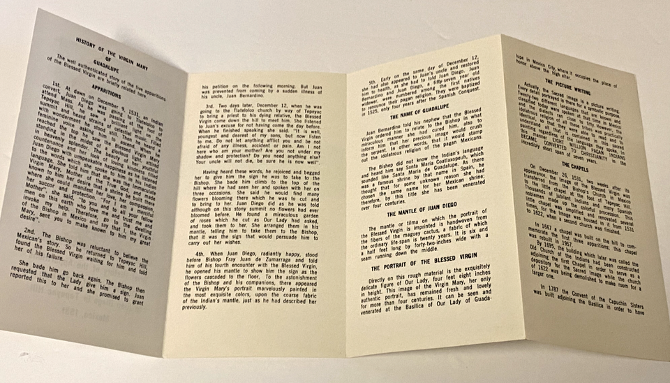 You are purchasing a vintage brief history of the apparitions of Our Lady of Guadalupe. They are accordion folded (4 fold) and were obtain in one of our pilgrimages to Her shrine in Mexico.