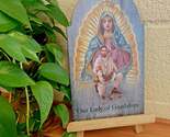 You are purchasing a beautiful image of Our Lady of Guadalupe with Juan Diego set on a arched wood plaque. It can be displayed on an easel or has opening for hanging on the wall.