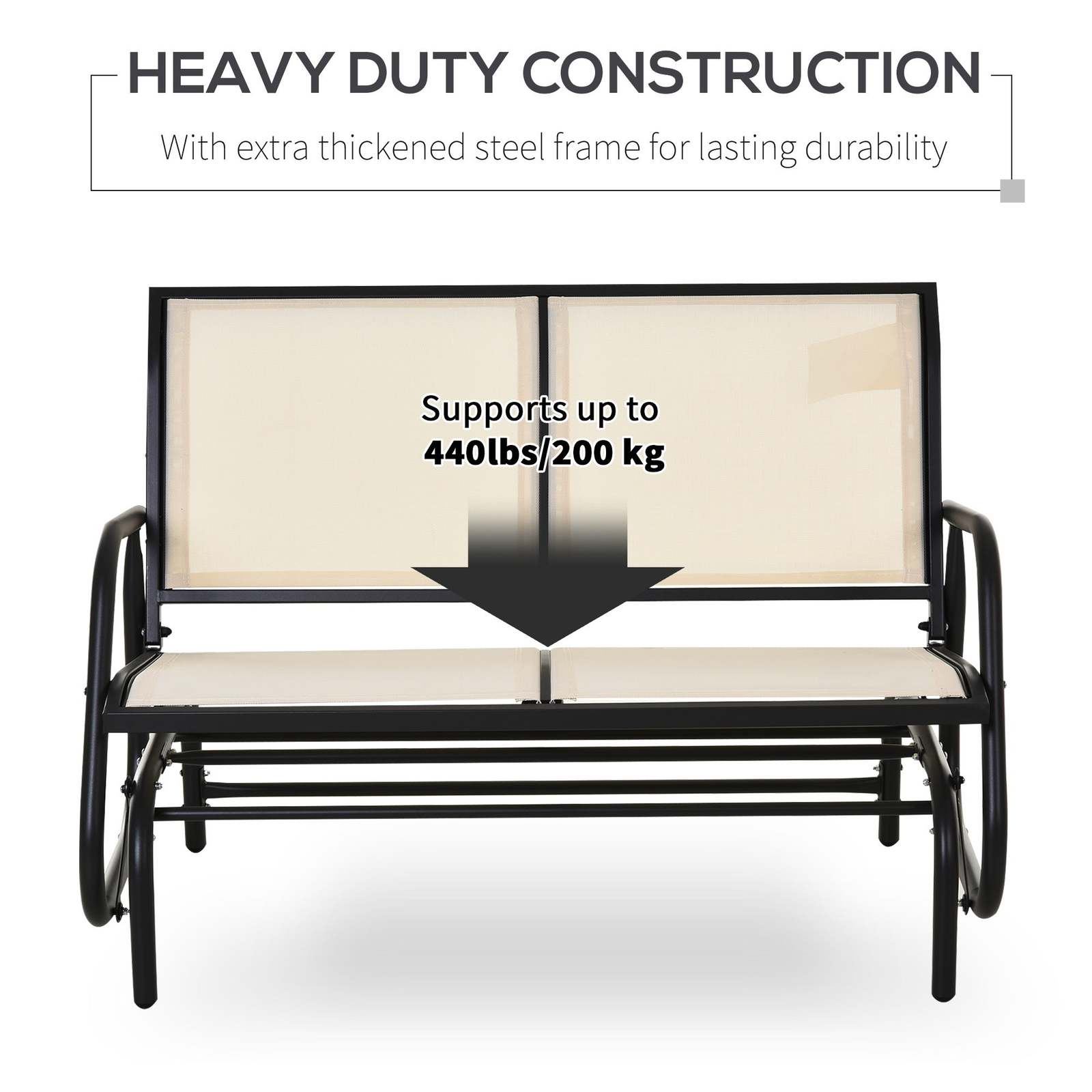 Steel Frame: This double porch glider has a wide seat and backrest to comfortably seat two people. Constructed of a water-safe powder-coated steel frame, our glider chair supports up to 440 lbs. while weighing only 31 lbs.