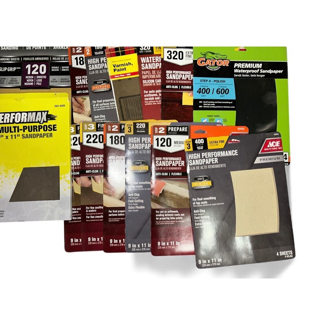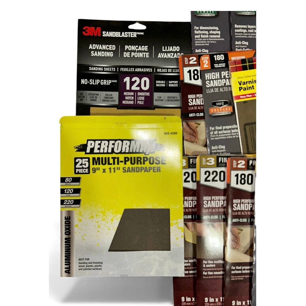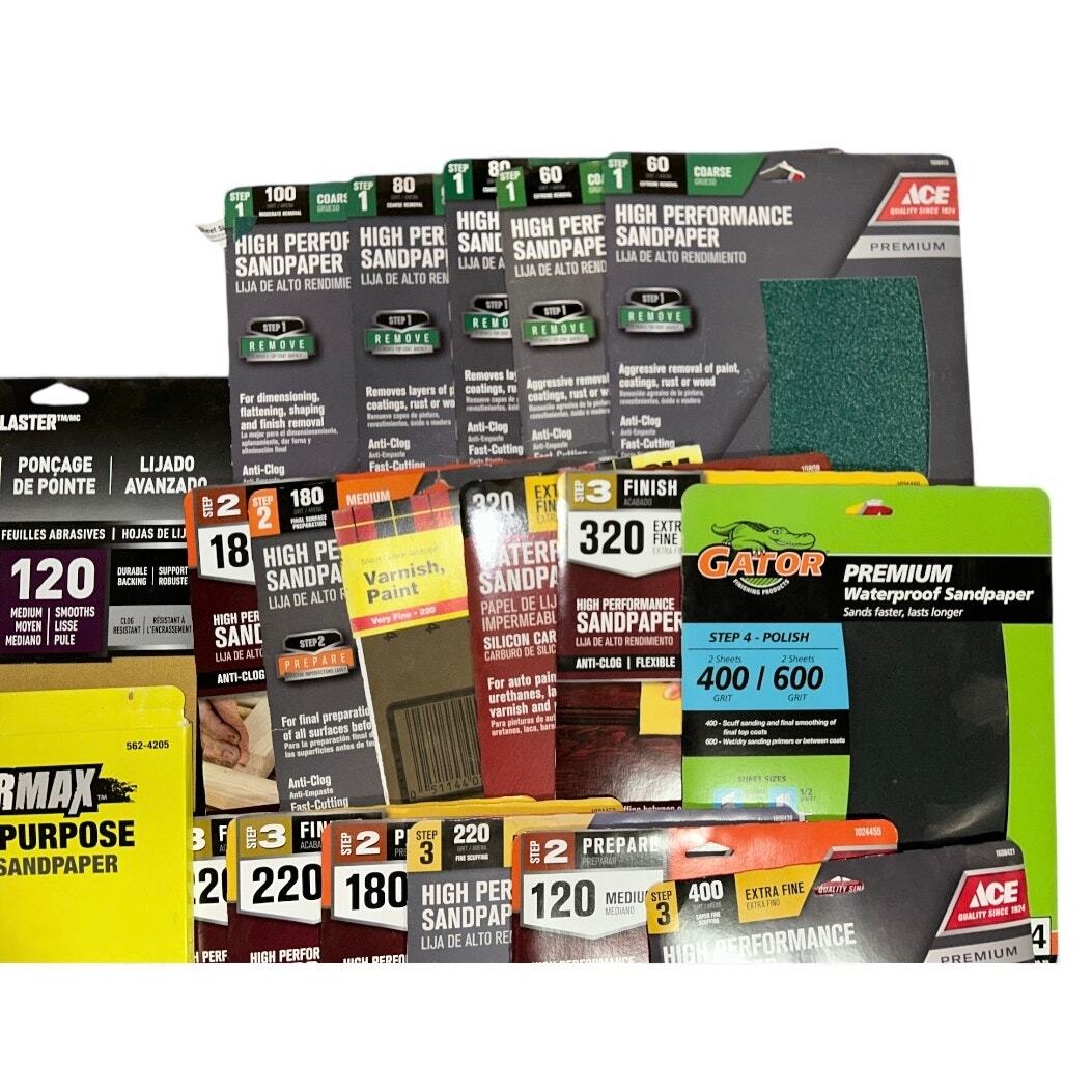- Over 7 lbs of Various Packages of Sand Paper Different Grains 3M Ace Gator