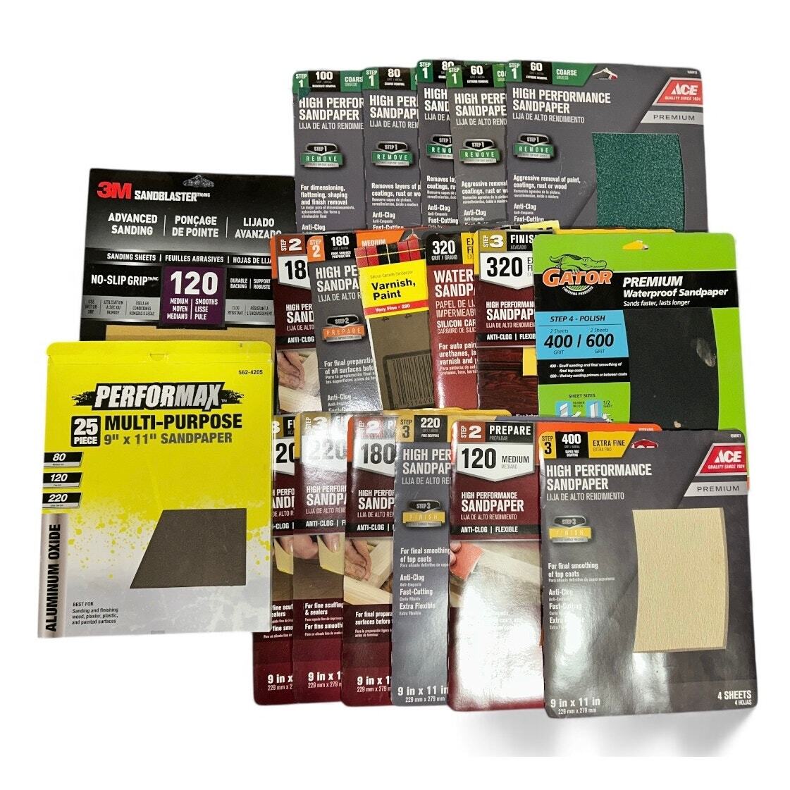 Over 7 lbs of Various Packages of Sand Paper Different Grains 3M Ace Gator