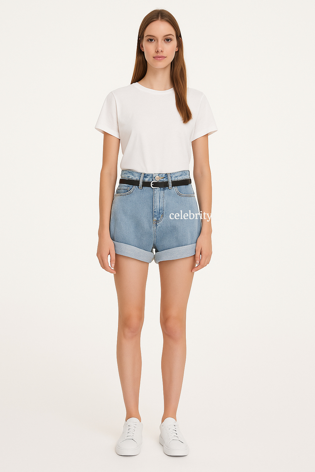 A pair of denim shorts are essentials for those warmer days. Featuring a rolled up hem, high waisted fit an back pockets all in a light blue blue wash denim. Pair with a cute boyfriend shirt and lace up sandals.