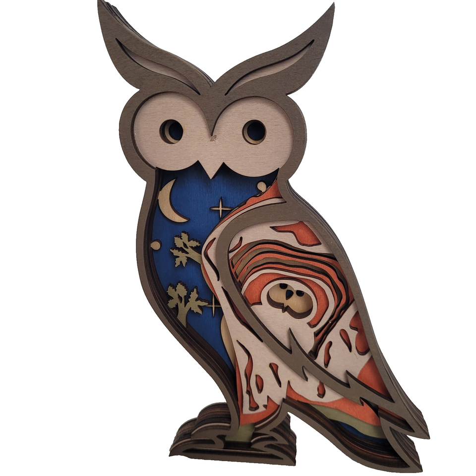 Blue Owl Handcrafted Layered Wood Art Measures About 8" x 5" x 1" Wise, mysterious, and beautifully bold?the Blue Owl is a handcrafted layered wood art piece that captures the enchanting essence of this nocturnal guardian. Meticulously made in Colorado, this design features multiple layers of sustainably sourced wood, precisely cut and stacked to create a stunning 3D profile of an owl, brought to life in rich shades of blue. With its piercing gaze, intricate feather detailing, and symbolic presence, the Blue Owl adds both depth and elegance to any room. Whether hung in a cozy reading nook, a nature-inspired space, or as part of a woodland-themed decor, this piece evokes a sense of wisdom and wonder. Crafted with care using eco-friendly materials, this owl is not just a piece of art?it?s a peaceful, powerful presence for your walls. Key Features: Handmade ? each Blue Owl is a unique work of layered craftsmanship. Made from premium sustainable wood for lasting durability and earth-conscious design. Multi-layered design offers a textured, eye-catching 3D effect. Features a majestic owl in calming blue tones?symbolizing wisdom, intuition, and protection. Perfect for libraries, bedrooms, nature-themed decor, or as a thoughtful gift.