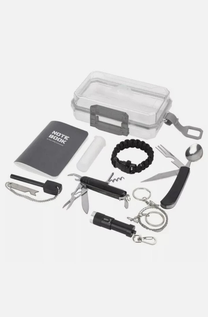 Featuring the 16-piece survival kit: Towels, fire starter, commando saw, waterproof notebook, keychain light, 8-in-1 multi-tool, spoon multi-tool, paracord bracelet with whistle, durable water-tight case.
