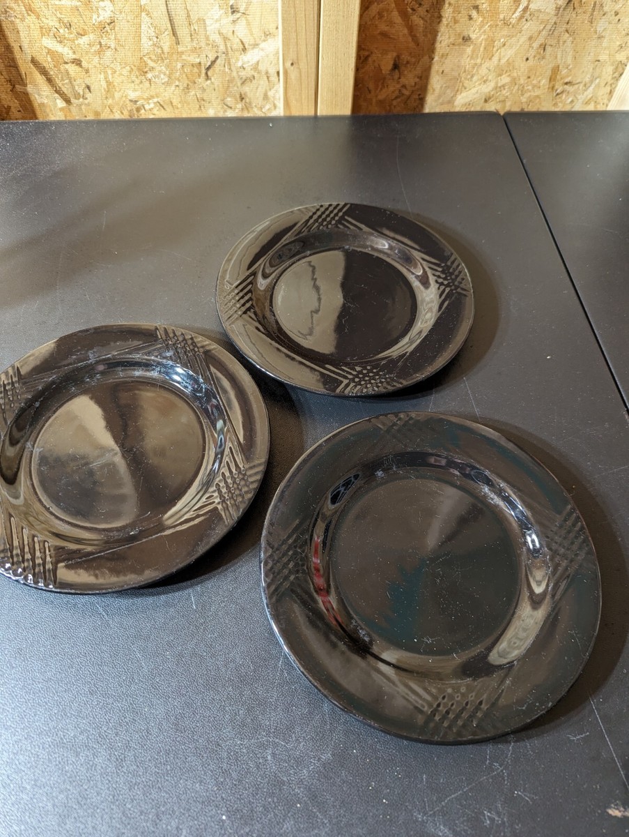 This three-piece set of salad plates, made in the USA in the 1990s, is a stunning addition to any contemporary table setting. The plates feature a round shape with a glossy black finish and a matte texture that adds an extra touch of sophistication. The plates are crafted from stoneware and were handmade using pottery techniques, making each one unique. The model is an original design, not a reproduction, and is part of the Sun product line. These plates are perfect for all occasions and make a great gift for vintage collectors. Each plate has a diameter of 8.5 inches and bears no brand or maker's mark. Add this beautiful set to your collection today!