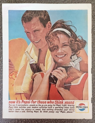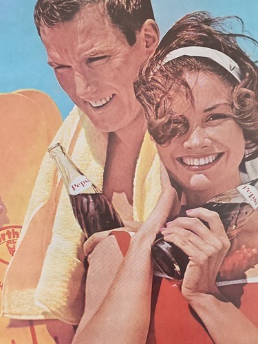 This sale is for One (1) Vintage ~ PEPSI-COLA Advertising Page 1963 Pepsi Cola Soda Pop Bottle Advertising Full-Page Magazine Print Ad 1963 Ad Publication ~ Life Magazine Measures approximately 10.5" wide x 13.5" tall Original print ad from 1963 Life magazine Pepsi advertising is in good ~ vintage condition Stored with stock card for support under plastic ~ perfect for framing Please view photos for a good description of this item Ad will be shipped in its plastic sleeve with backing\stock card ~ cardboard support on both sides ~ inside a heavy duty ~ poly bubble mailer ~ for safe arrival Thank you!