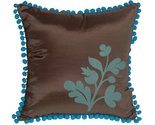 This delightful throw pillow has a fringe of lively, blue pom poms around the edge and a bold floral blue print in the corner. The background color of the pillow is a solid shimmering white and the back of the pillow is a solid shimmering blue. Match it up with our large Bohemian Damask throw pillow and you have a wonderful contemporary pillow design story in your home.
