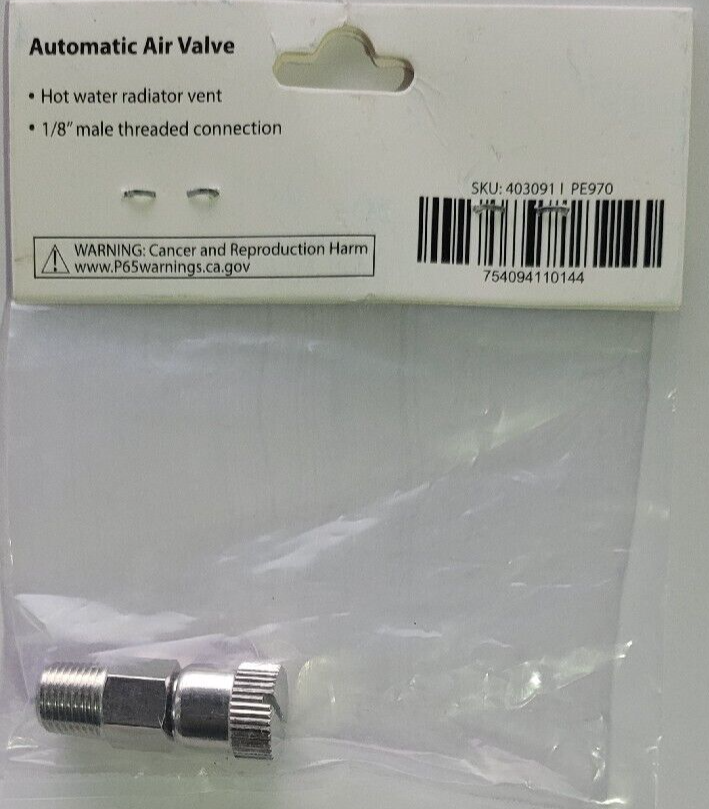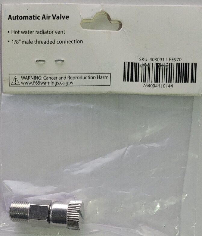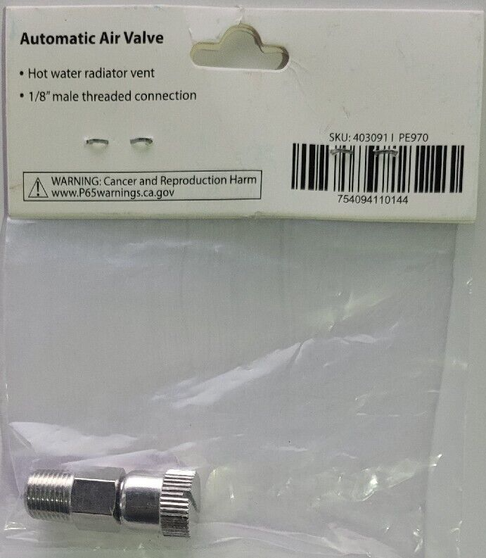 You are Buying a brand New And Factory Sealed PLUMBERS EDGE Automatic Hot Water Air Valve Model # PE970..... connection on this hot water vent is 1/8" male threaded connection. Hot water radiator vent 1/8 in. male threaded connection Used for hot water heating system applications.....