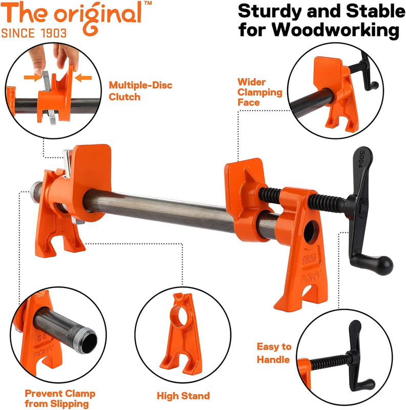 Store New Arrivals Add to Favorite View Feedback Contact PRO Pipe Clamps 3/4 Inch , 2-Pack Heavy-Duty Wood Gluing Pipe Clamp Fixtur Description Item model number H_3/4_Inch Part Number 99221AE Style H Style 3/4 Inch Size H Style 3/4 Inch Power Source Hand Powered Item Package Quantity 2 Color Orange Pattern Pro Design Material Cast Iron Batteries Required? No Item Weight 8.75 pounds Batteries Included? No Set Name 2-Pack Package Dimensions 12.6 x 7.48 x 4.29 inches Included Components 2PC PRO 3/4" PIPE CLAMP FIXTURE ?PONY PRO 3/4? Pipe Clamps? Suitable for 3/4? with any length of black pipe. Our wood clamps are professional for you to release your hands and work more efficiently. ?Wide Applications? PONY sturdy pipe clamps for woodworking are great for almost any length of woodworking project. The big clamping face is suitable for more woodworking projects. The clamping face is 2-1/8". ?Iron Cast Material? Made of tough iron cast, equipped with multiple-disc clutch for high clamping pressure, providing quick and secure adjustment. Removing the clamps when the job is done is quick and easy every time. ?High Stand?2-3/8? high stand provides stable work base. Our gluing pipe clamp is great for woodworking in home or store. With the help of pipe clamps, professional and efficient woodworking operations can be achieved in a fraction of the time. ?Easy to Use? Adjust the handle to strengthen the clamping force and add a coil spring to prevent clamps from slipping. Easy to assemble, ideal for woodworking with a wide range of applications from industrial to do-it-yourself type projects. Product description Big clamping face is suitable for most woodworking projects. 2-3/8? high stand provides stable work base and helps you improve work efficiency. ABOUT US We offer the best prices around on high quality products. Our E-store includes media such as books, movies, music and games while offering electronics, toys, sporting apparel, clothing, tools, general home, garden items and more. SHIPPING We are always working hard to ensure your package arrives as soon as possible. Please understand that some factors like weather, high postal traffic, and the performance of shipping companies are outside of our control. RETURNS We offer a 30-Day Return Policy on items which you are not completely satisfied with. You have the option for a full-refund or an exchange of the item. PAYMENT We accept PayPal. CONTACT US This page content is yet to come Please ad us to your favorite seller and visit again later Thank You CUSTOMER SATISFACTION We try our very best to make sure every customer is completely satisfied. If there's a problem, message us! We're happy to help.