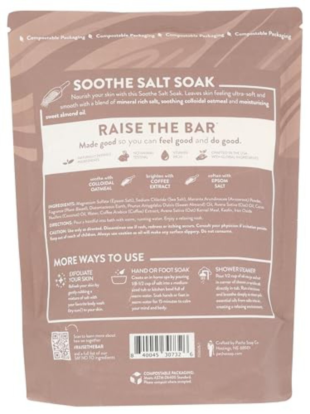 PACHA SOAP Soothe Salt Soak, Mineral Rich Salt 32 OZ Description Our Salt Soak blends are handcrafted with purpose and in a bulk size to last for many baths to come. Soak and restore your body with mineral rich salt, soothing essential oils and softening clays. Why Buy? Plant-Based, Cruelty Free, Naturally Derived, Crafted in the USA with Globall Ingredients, Vitamin Rich Ingredients Instructions Pour a handful into bath with warm, running water. Enjoy a relaxing soak. (description exceeds maximum possible length)