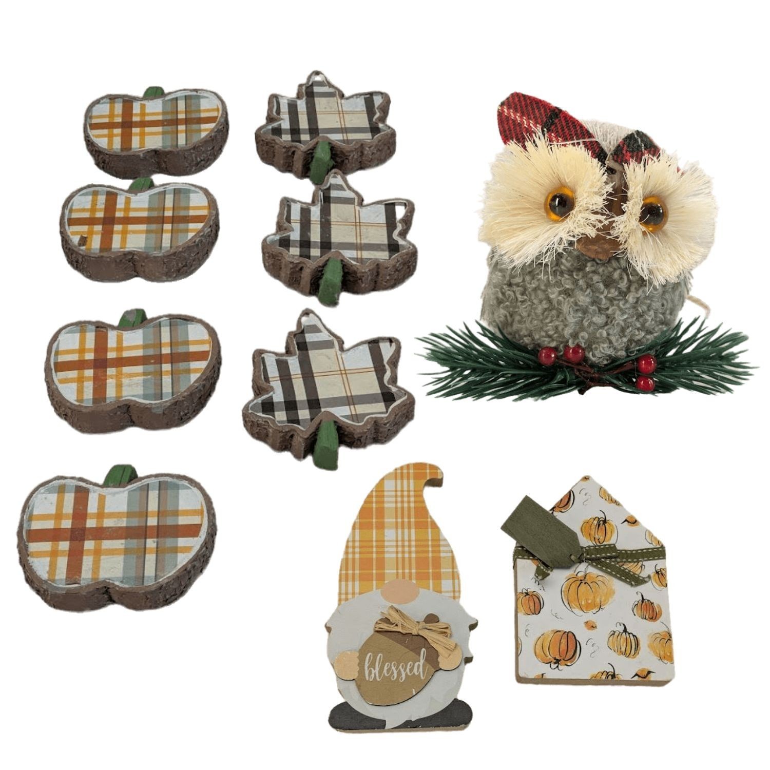 Pack of 10 Happy Holidays Owl Ornaments, Pumpkin, Leaf Gnome Table Decoration
