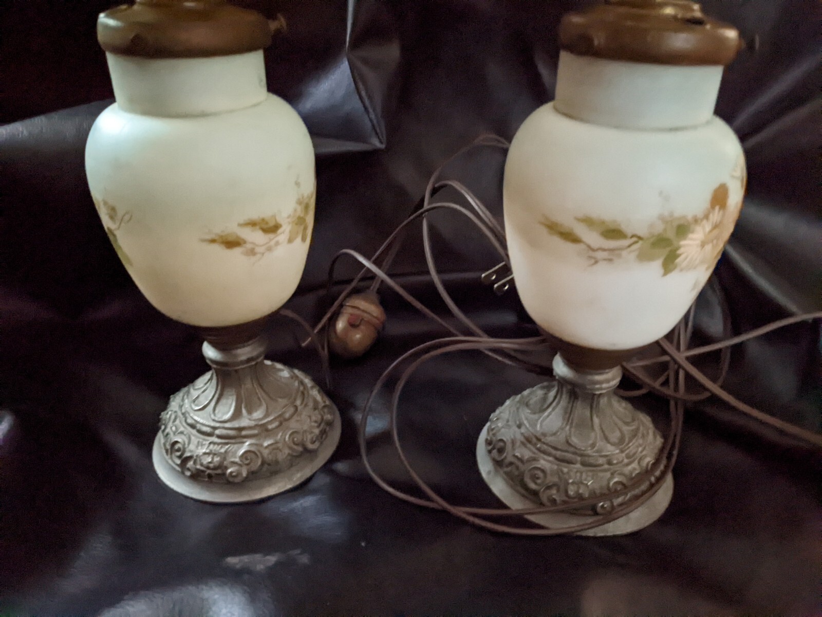 In vendita e una coppia Monte Washington Electric Boudoir Lampada da tavolo in raso con decorazione di fiori. Le luci sembrano essere elettrificate.
