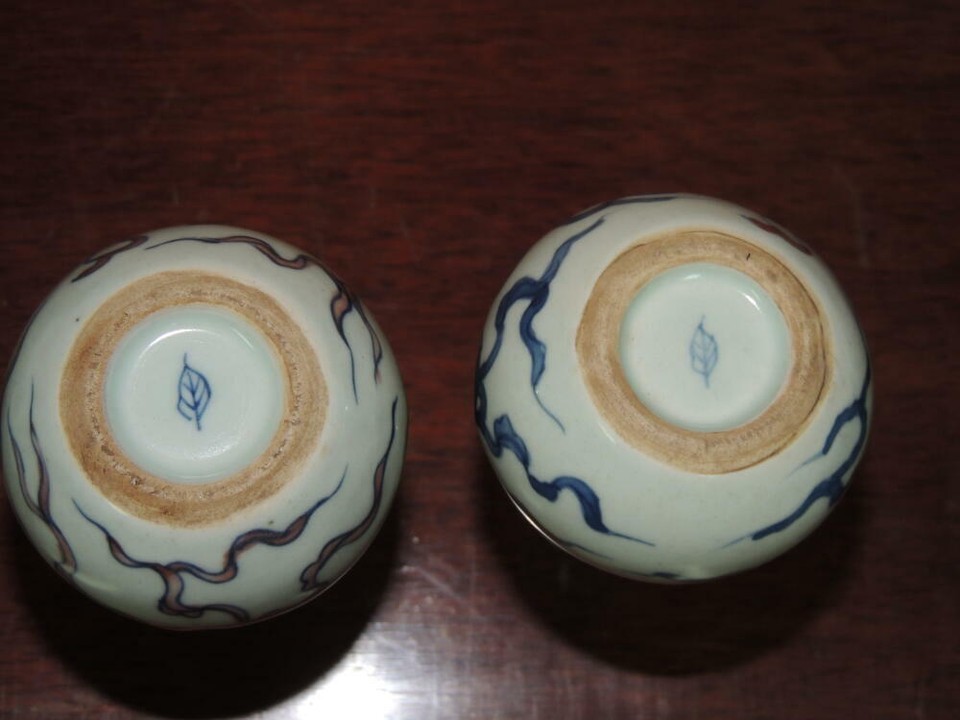 - Pair Bottle Vase 6"+ Hand Painted Blue Red Foo White Kangxi Leaf Mark Antique